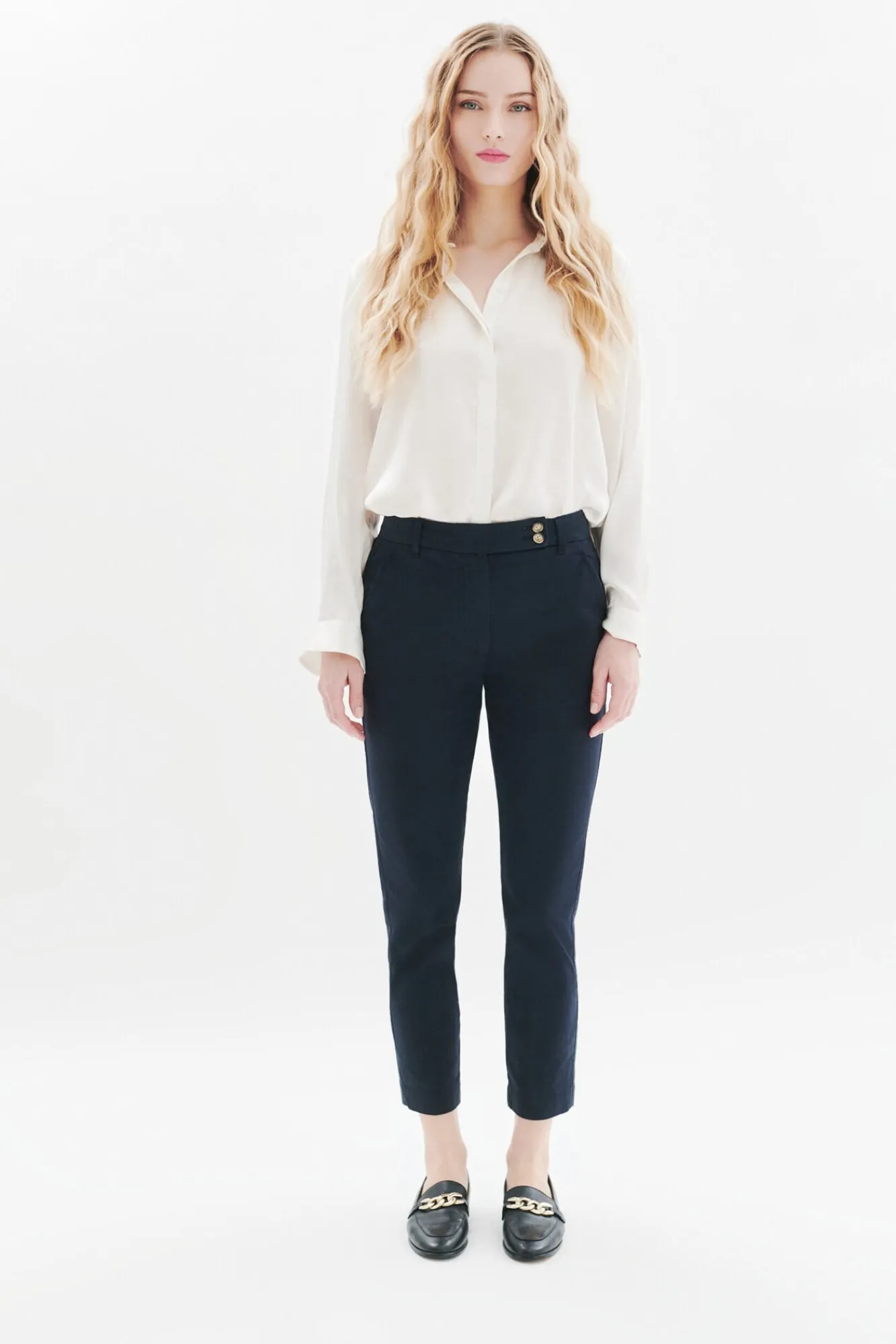 -A calça Piloti pode ser combinada com uma camisa fluida e uns mocassins adornados para um look casual chic