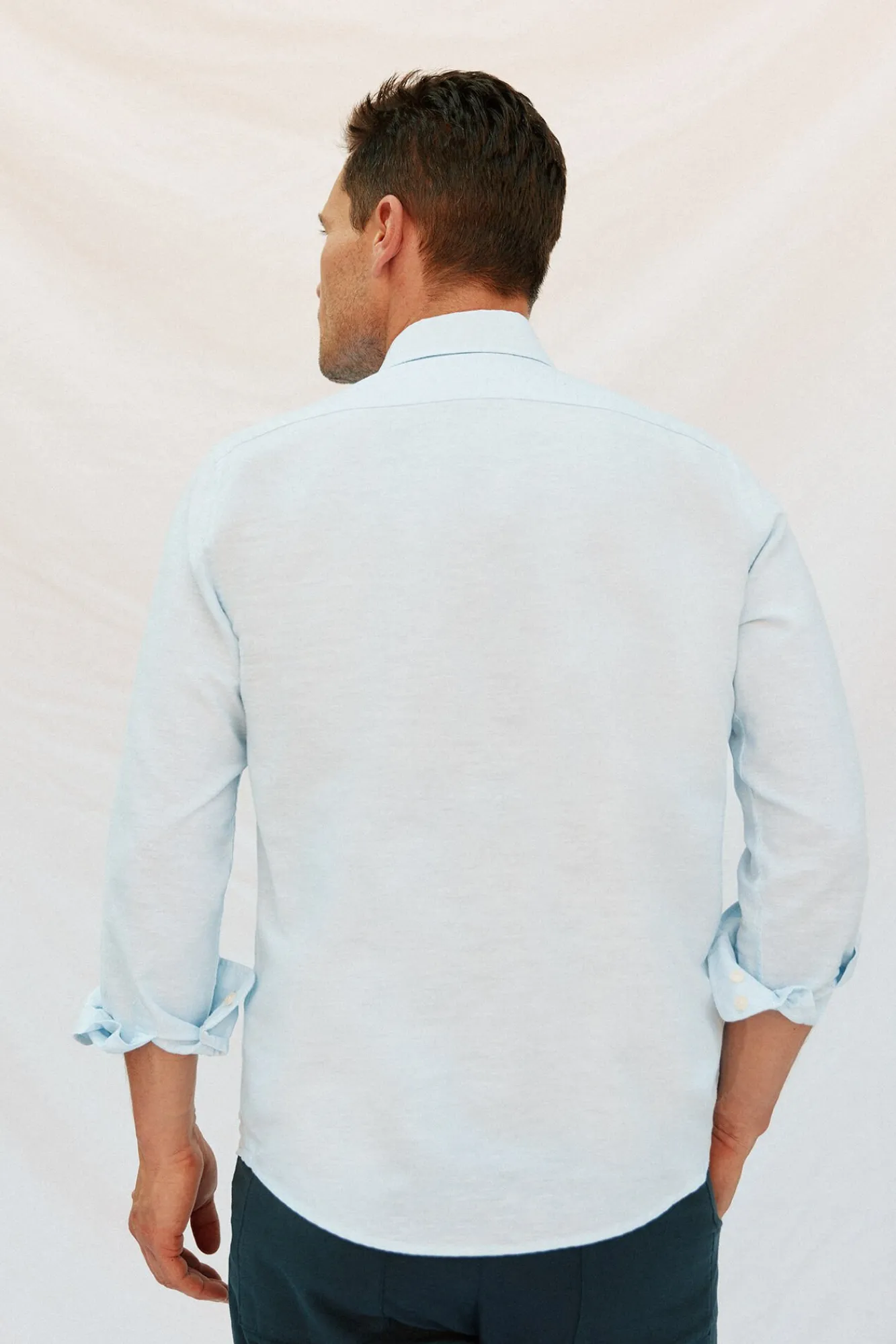 -51% linho e 49% algodão, tecido liso , lavado para maior maciez
