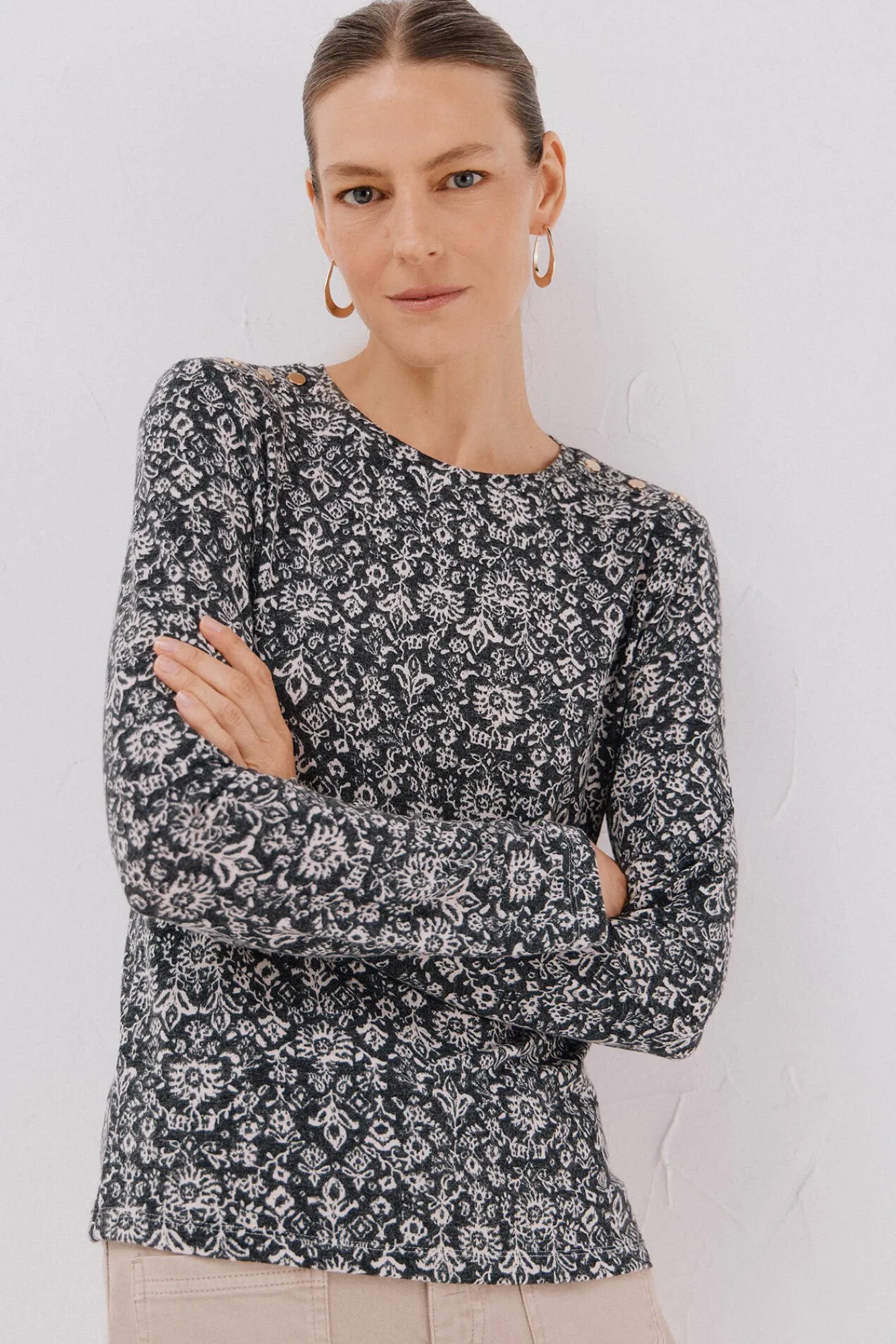 -Decote redondo com botões dourados no ombro