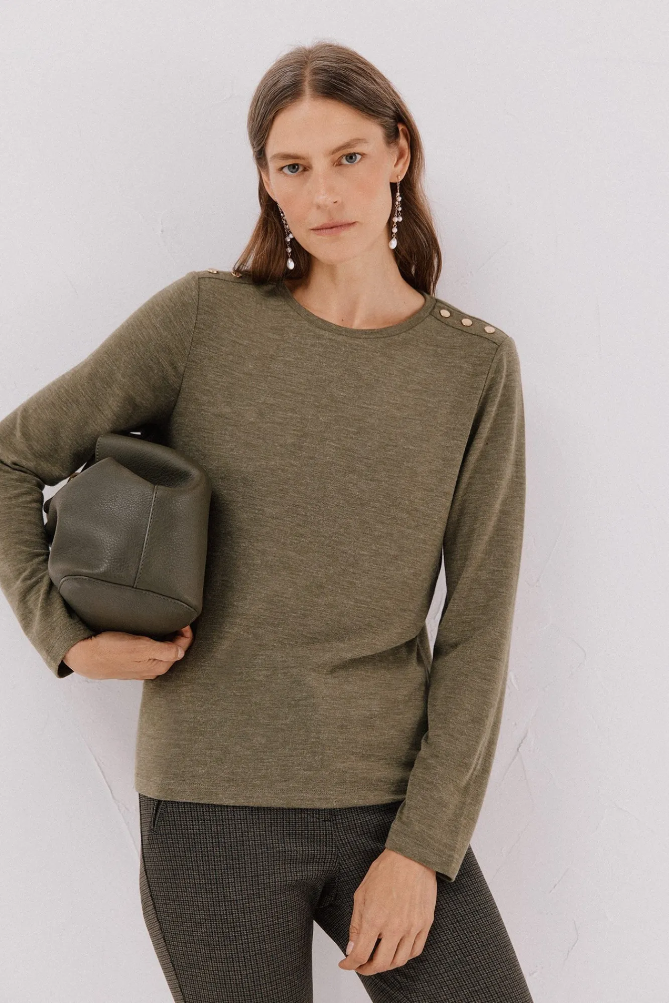 -Decote redondo com botões dourados no ombro