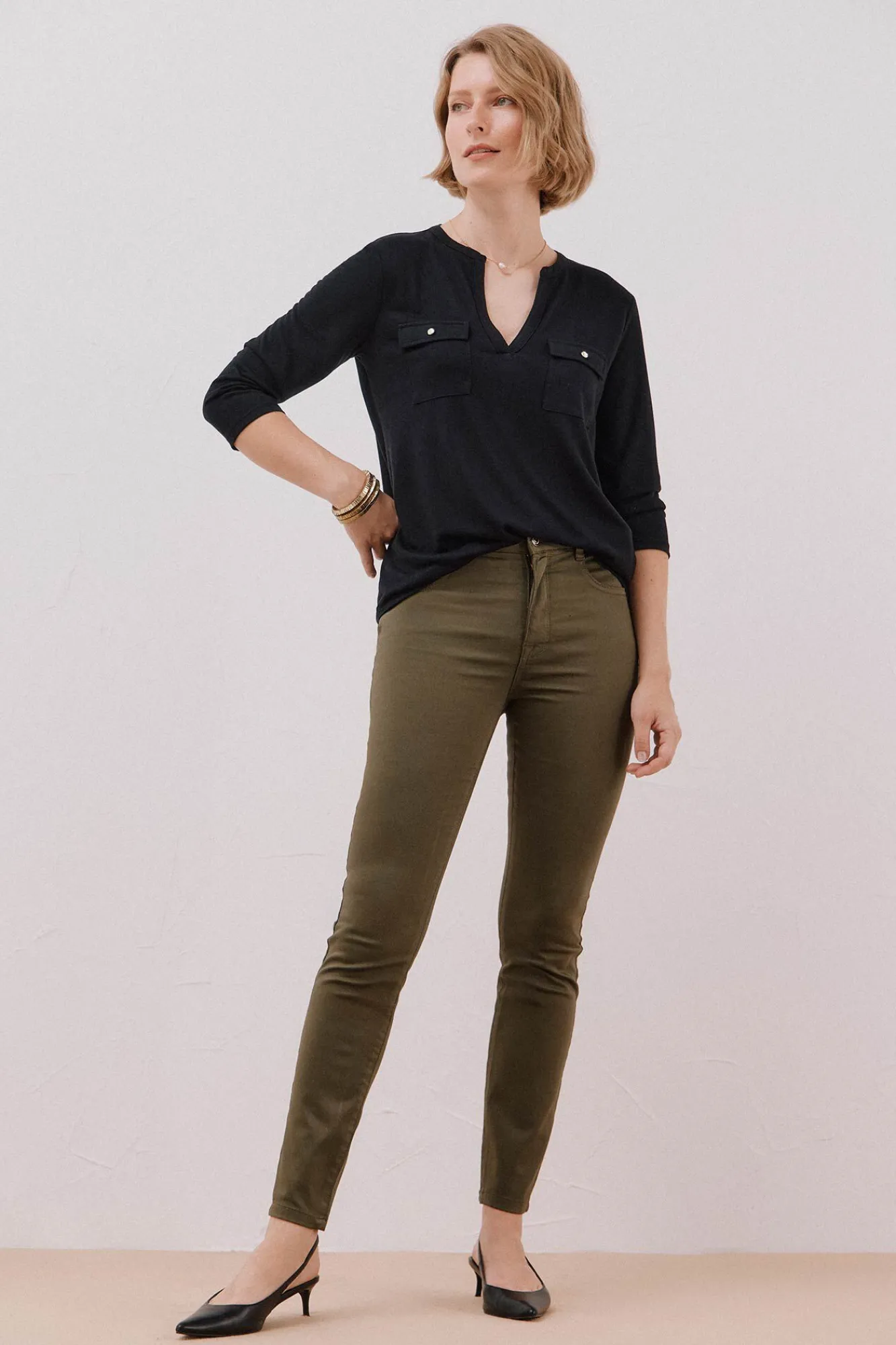 – Bolsos frontais com botão de metal dourado