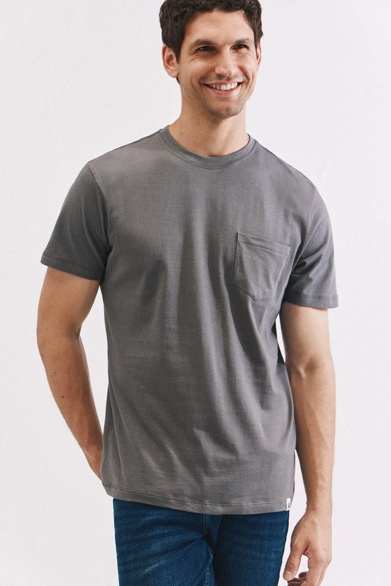 -Gola redonda, bolso no peito e etiqueta da marca na baixo