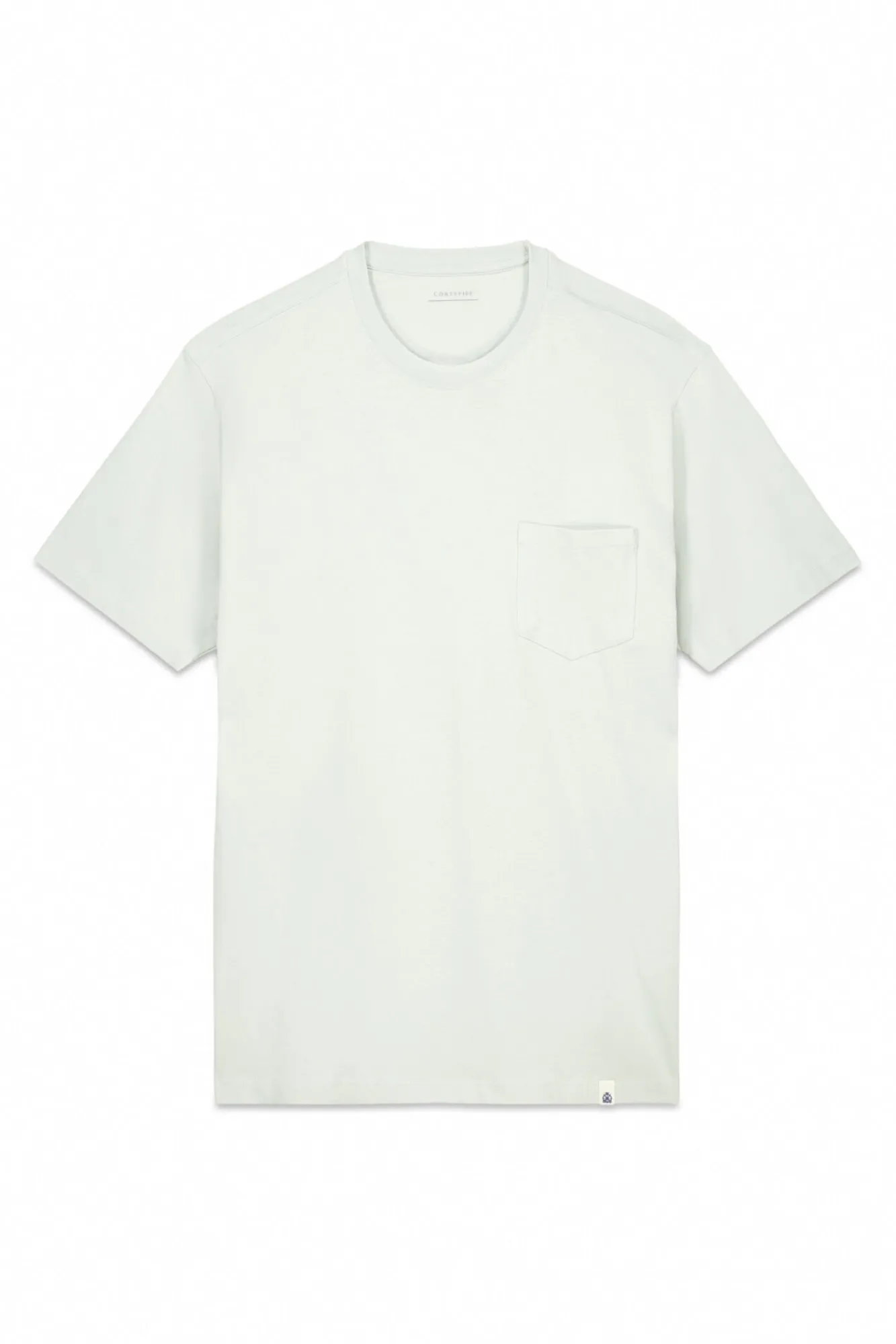 -Gola redonda, bolso no peito e etiqueta da marca na baixo