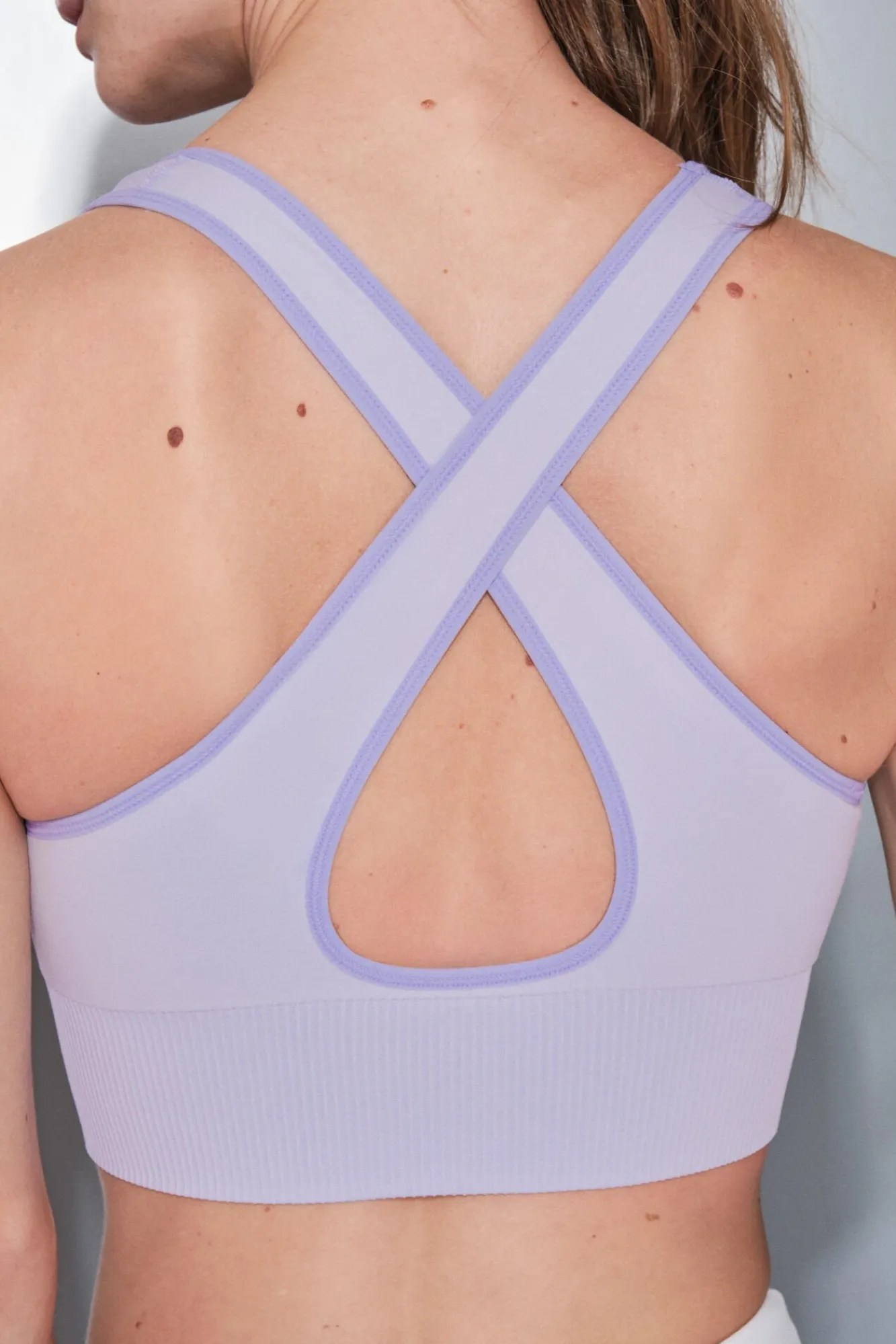 – Com decote redondo na frente e cruzado nas costas.