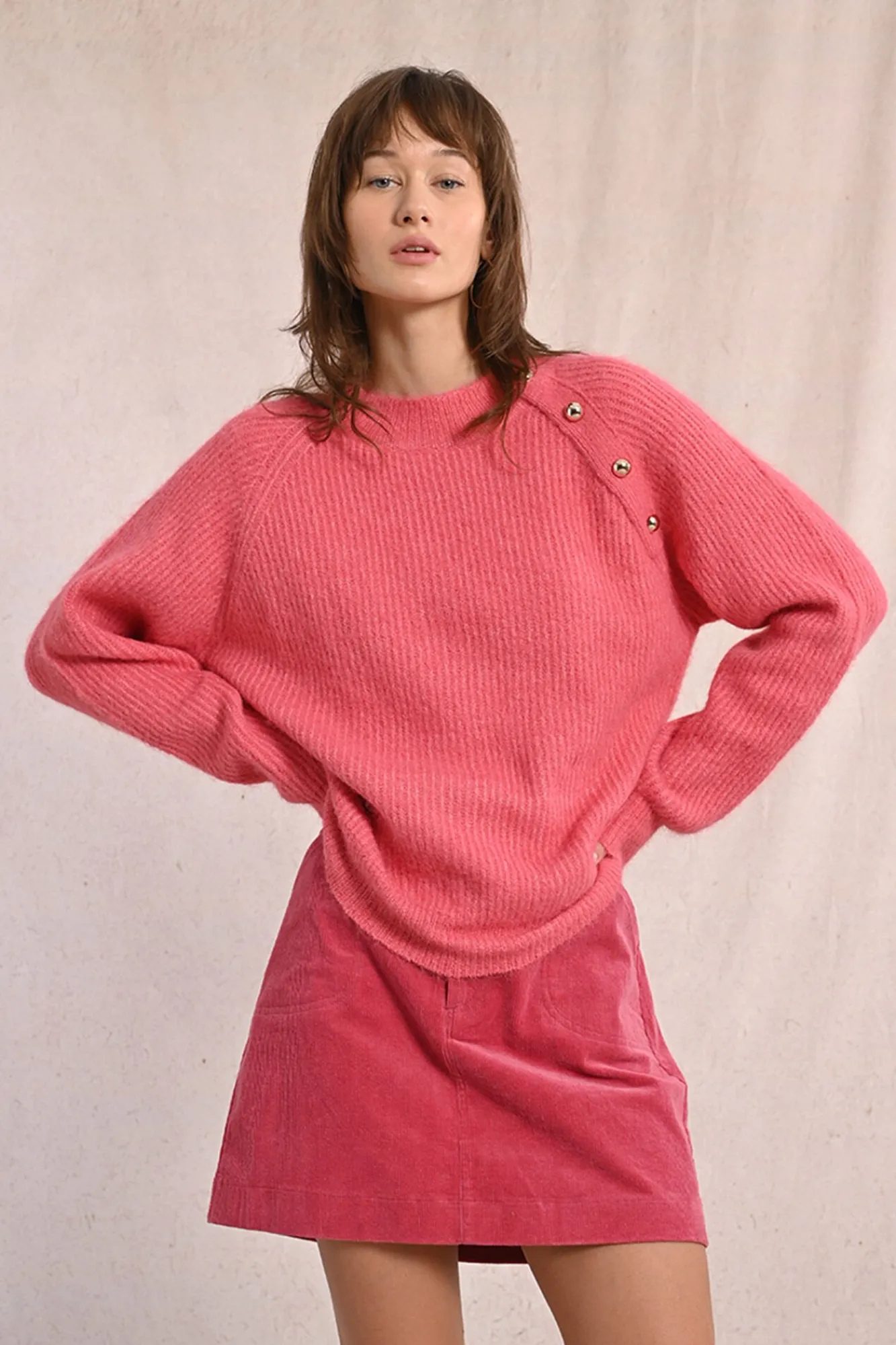 – Modelo com detalhe de botão dourado na lateral.