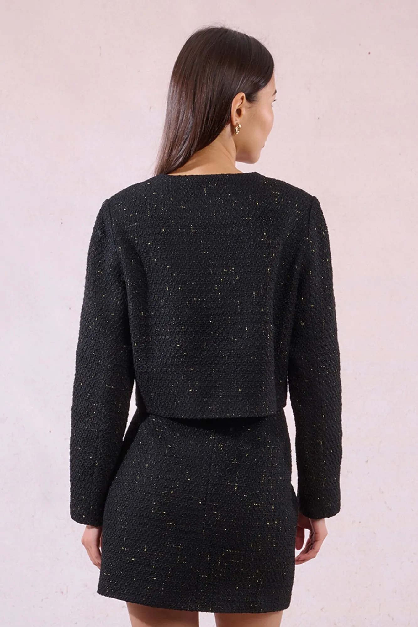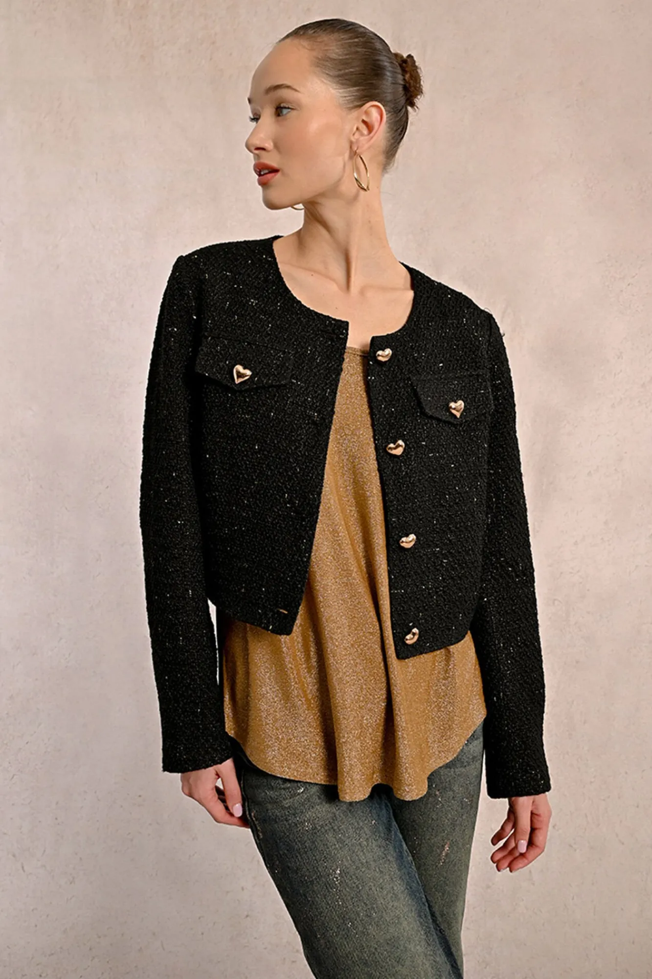 – Modelo em tecido tweed, com bolsos frontais e corações.