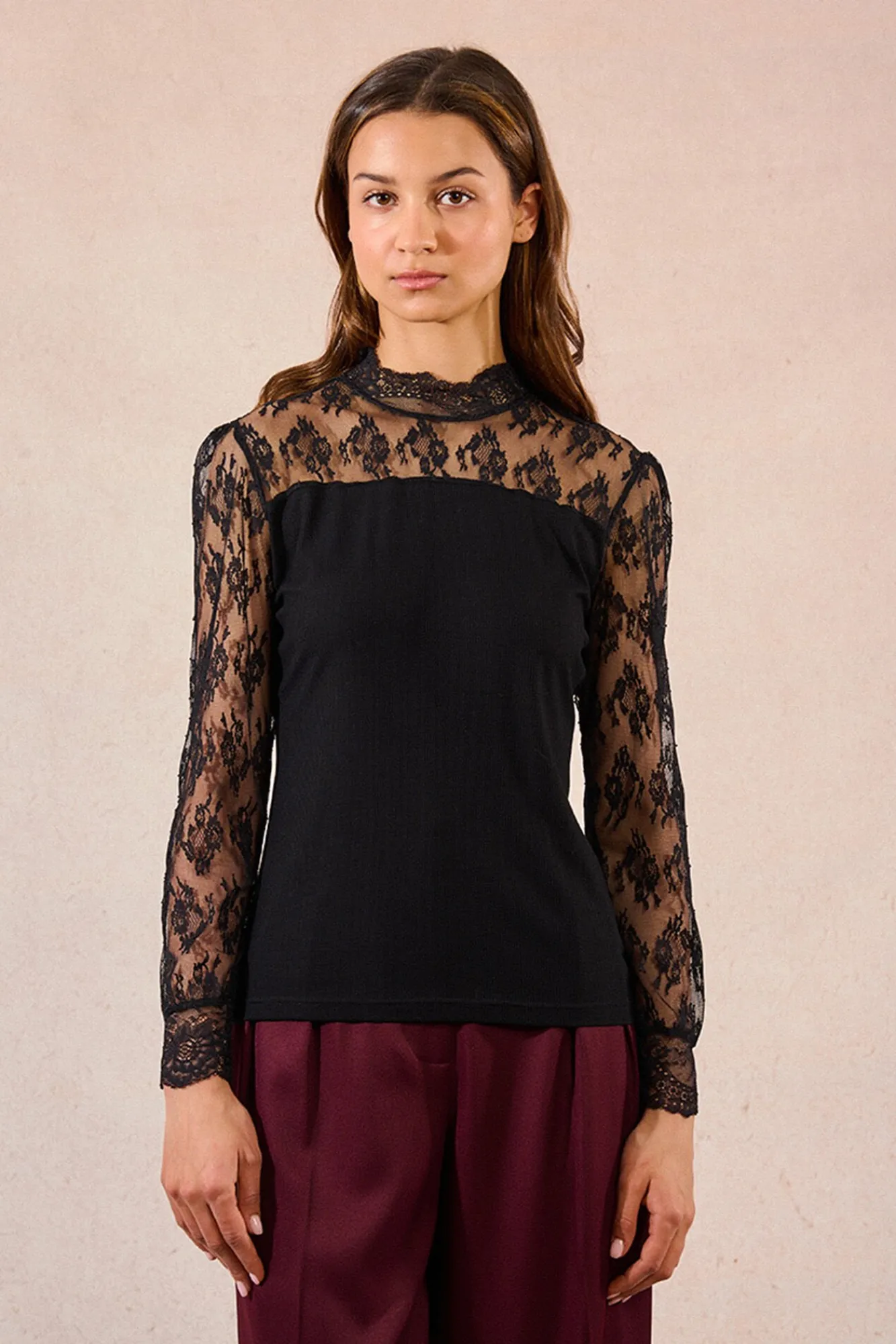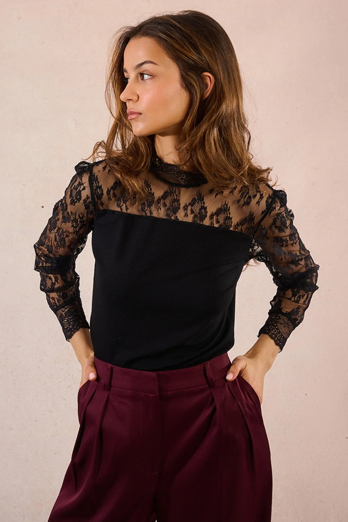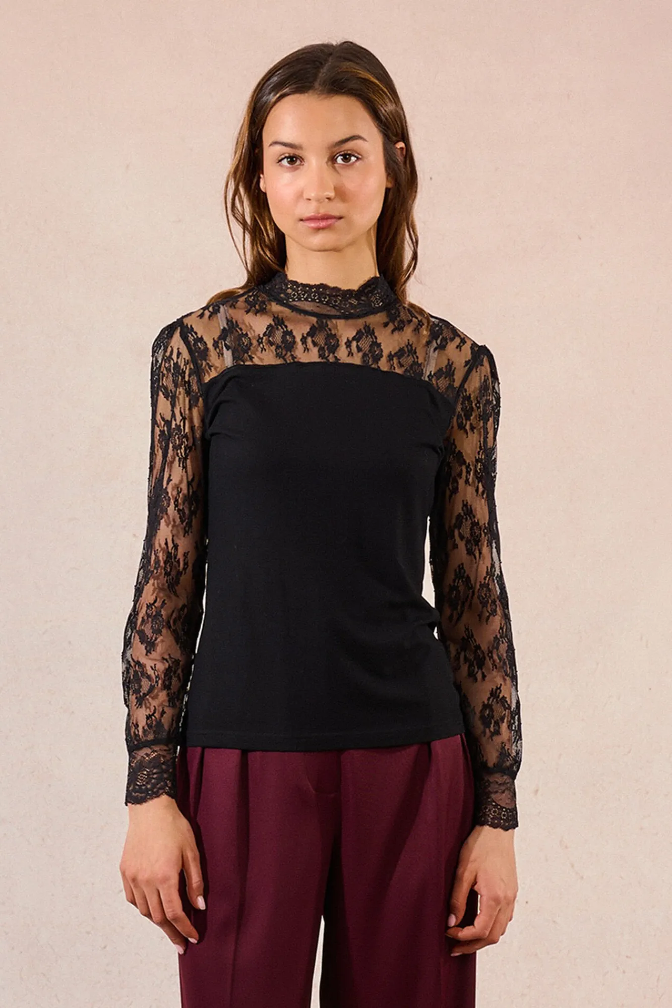 – Modelo com decote e mangas em tecido de renda.