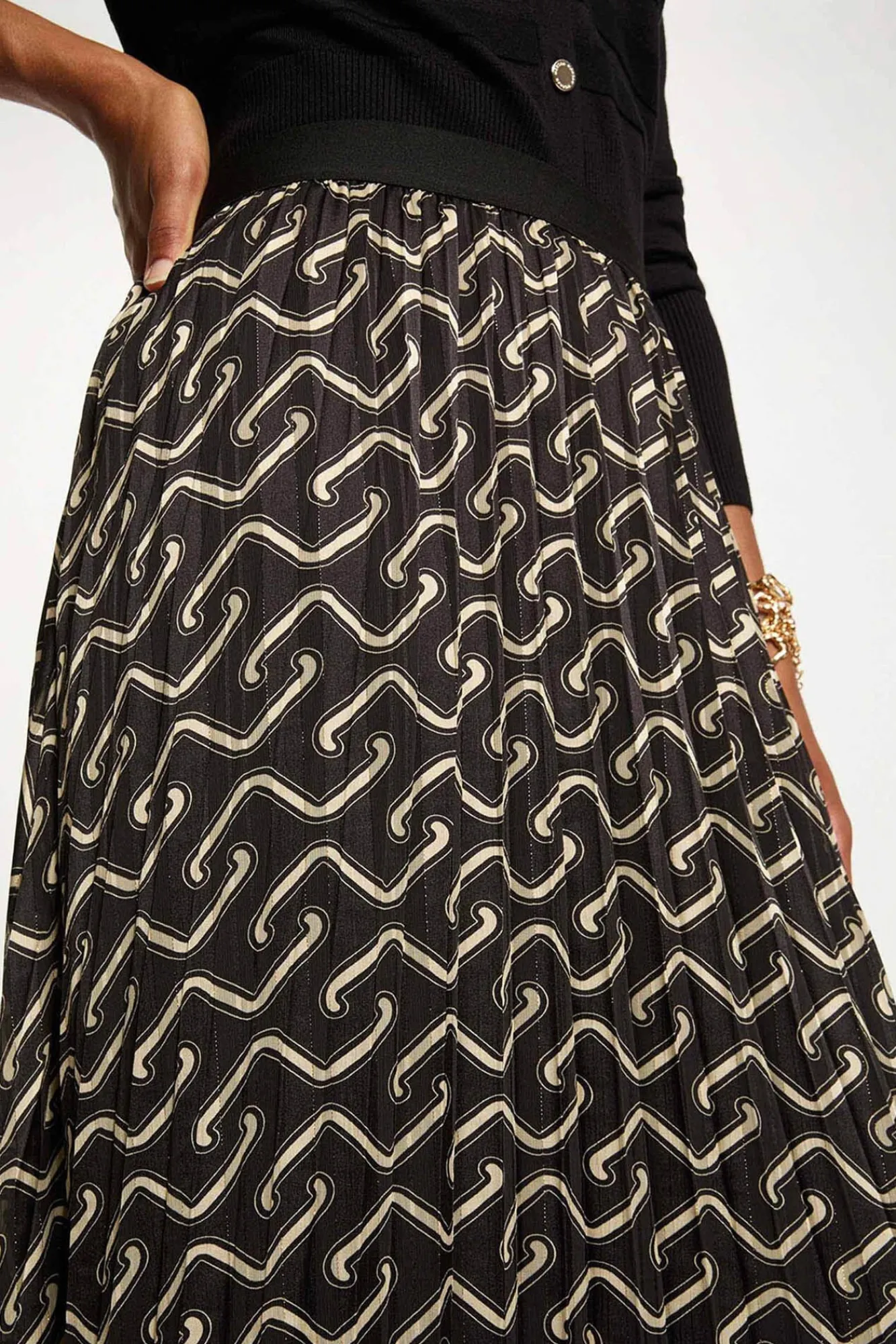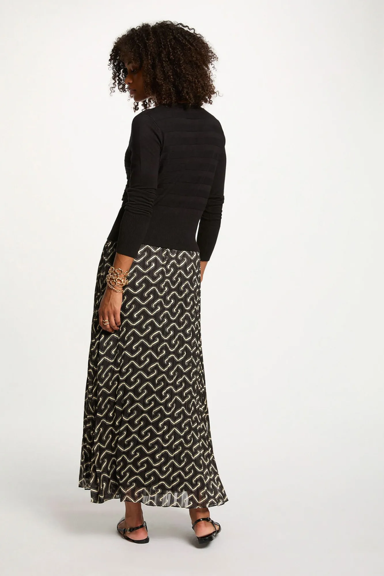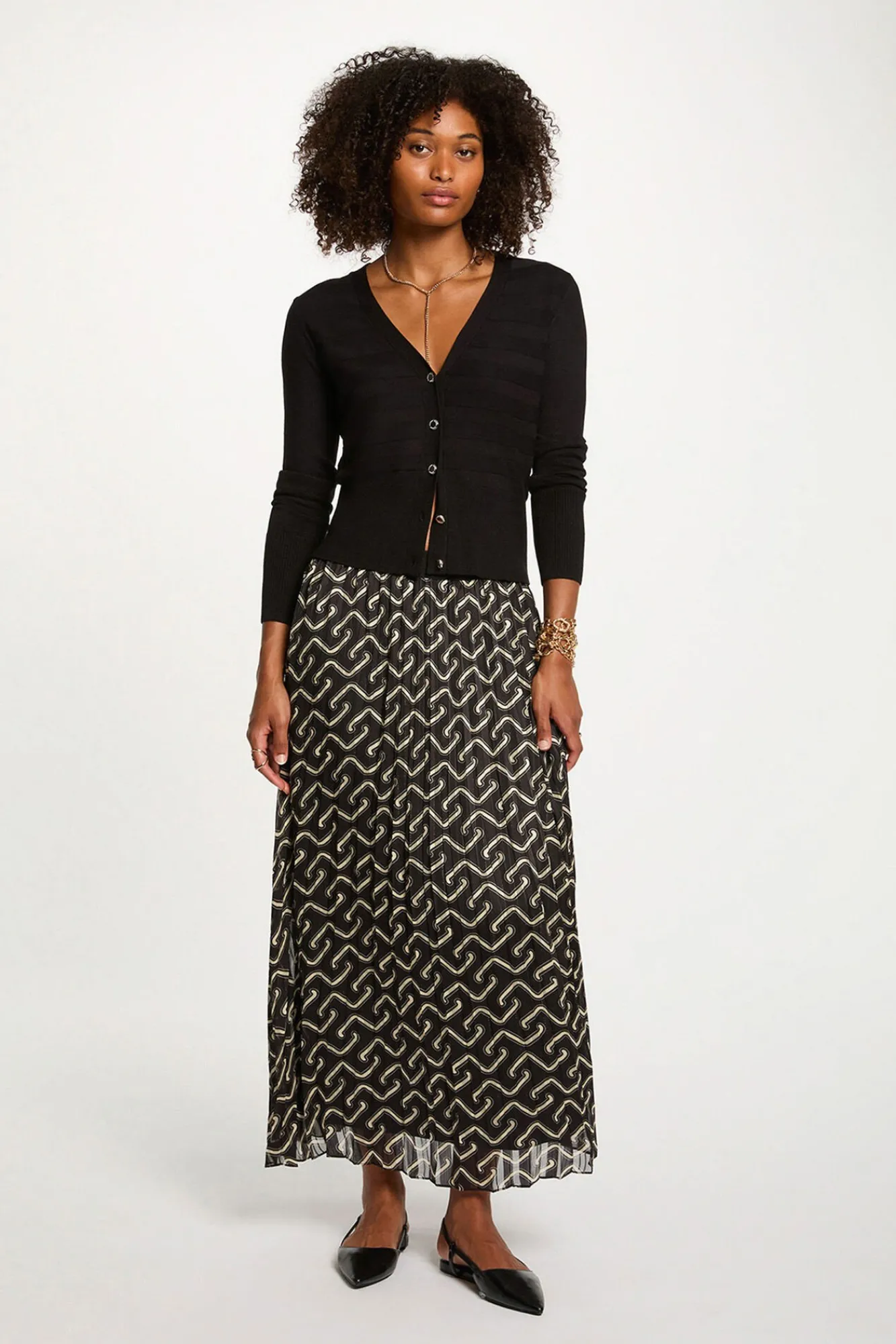 — A saia plissada fluida pode ser combinada com um casaco de malha ajustado e sabrinas elegantes para um estilo sutilmente feminino.