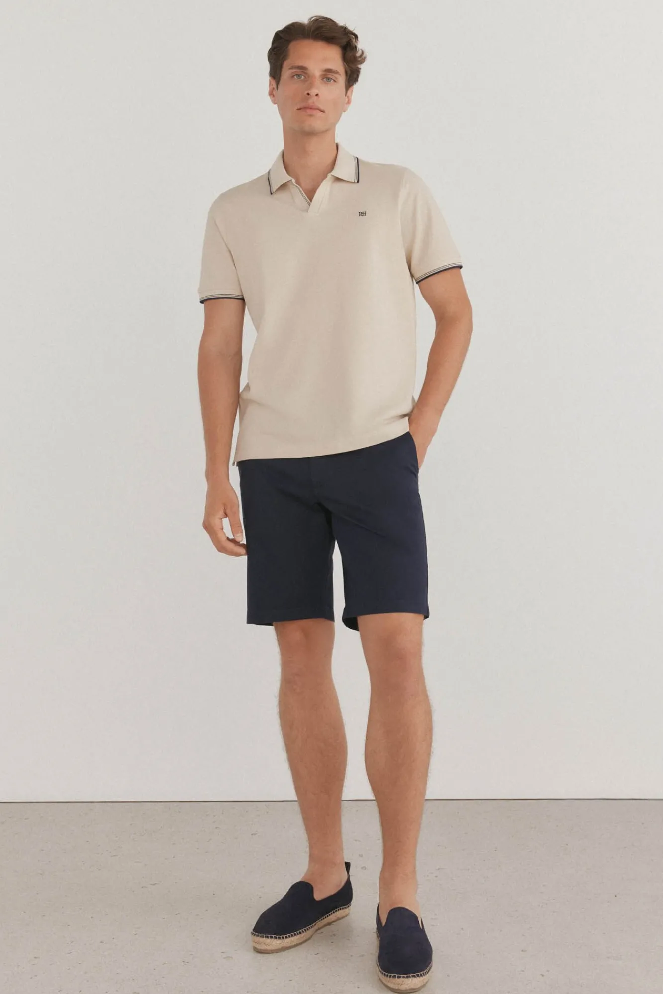 – Gola em V aberta com logótipo bordado no peito