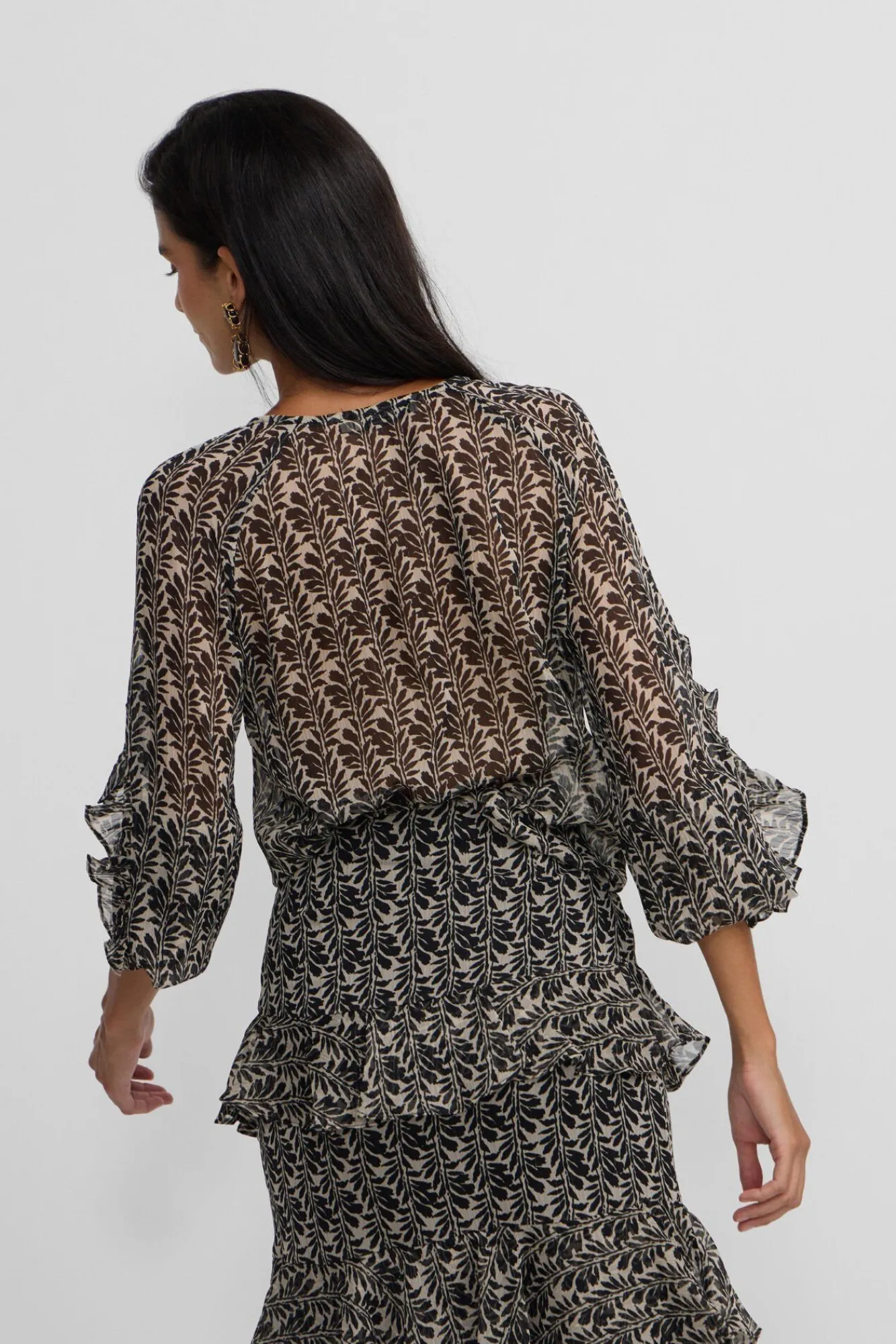 – Possui decote em V, manga bufantes com punhos elásticos e detalhe de folho nos ombros e mangas