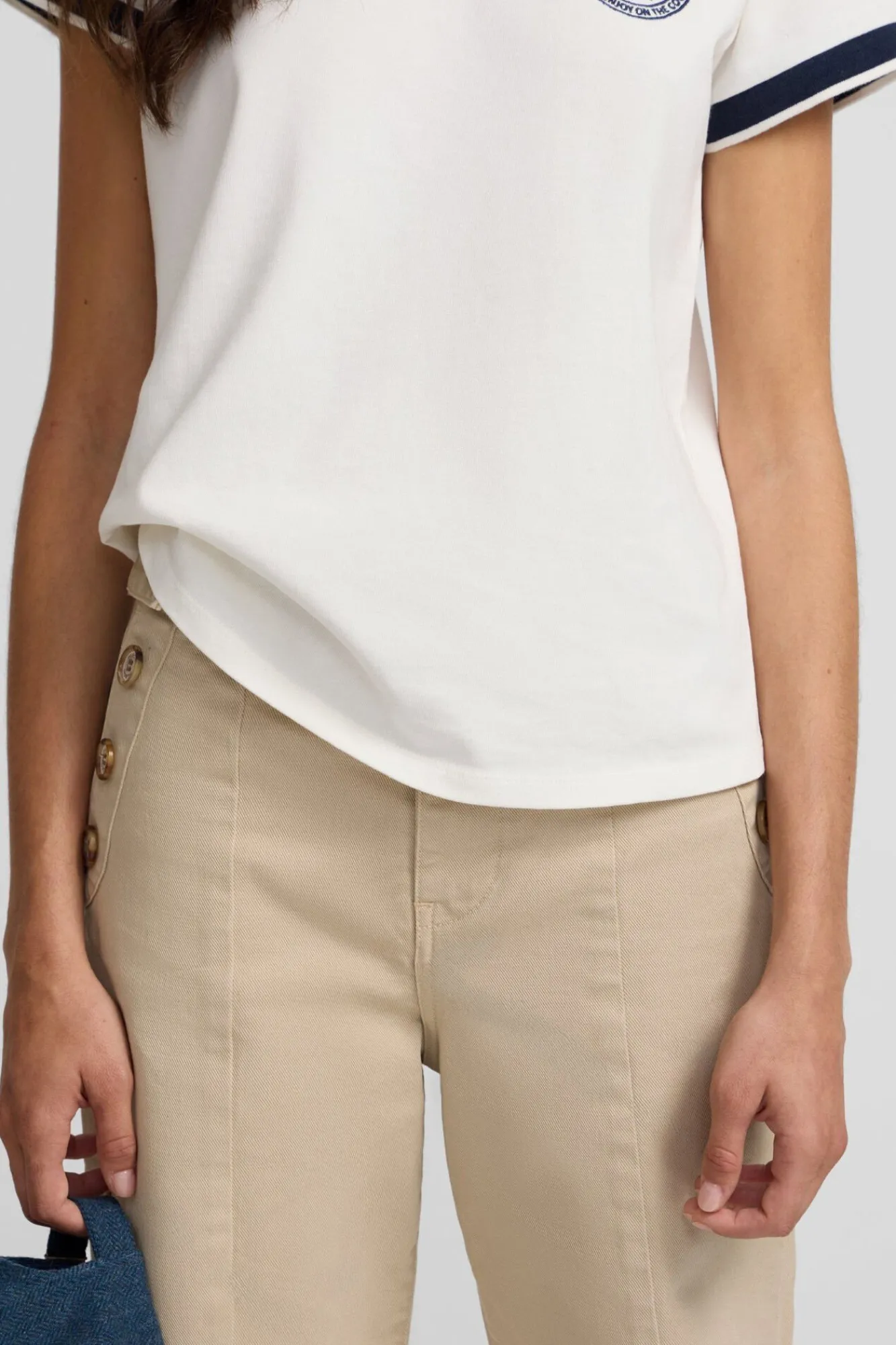 – Apresenta detalhes de costura decorativa com efeito de linha passada e bolsos laterais estilo calças chino
