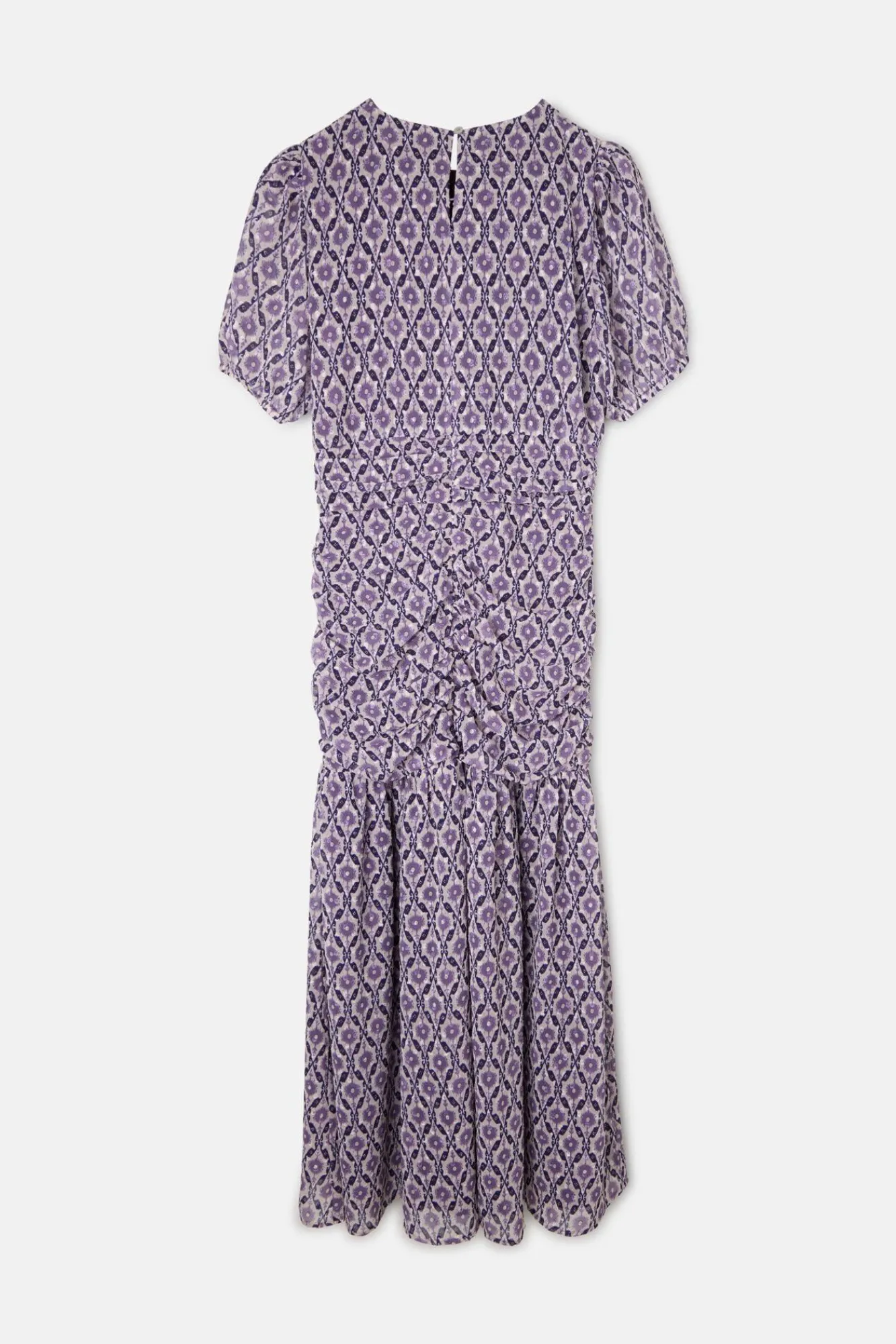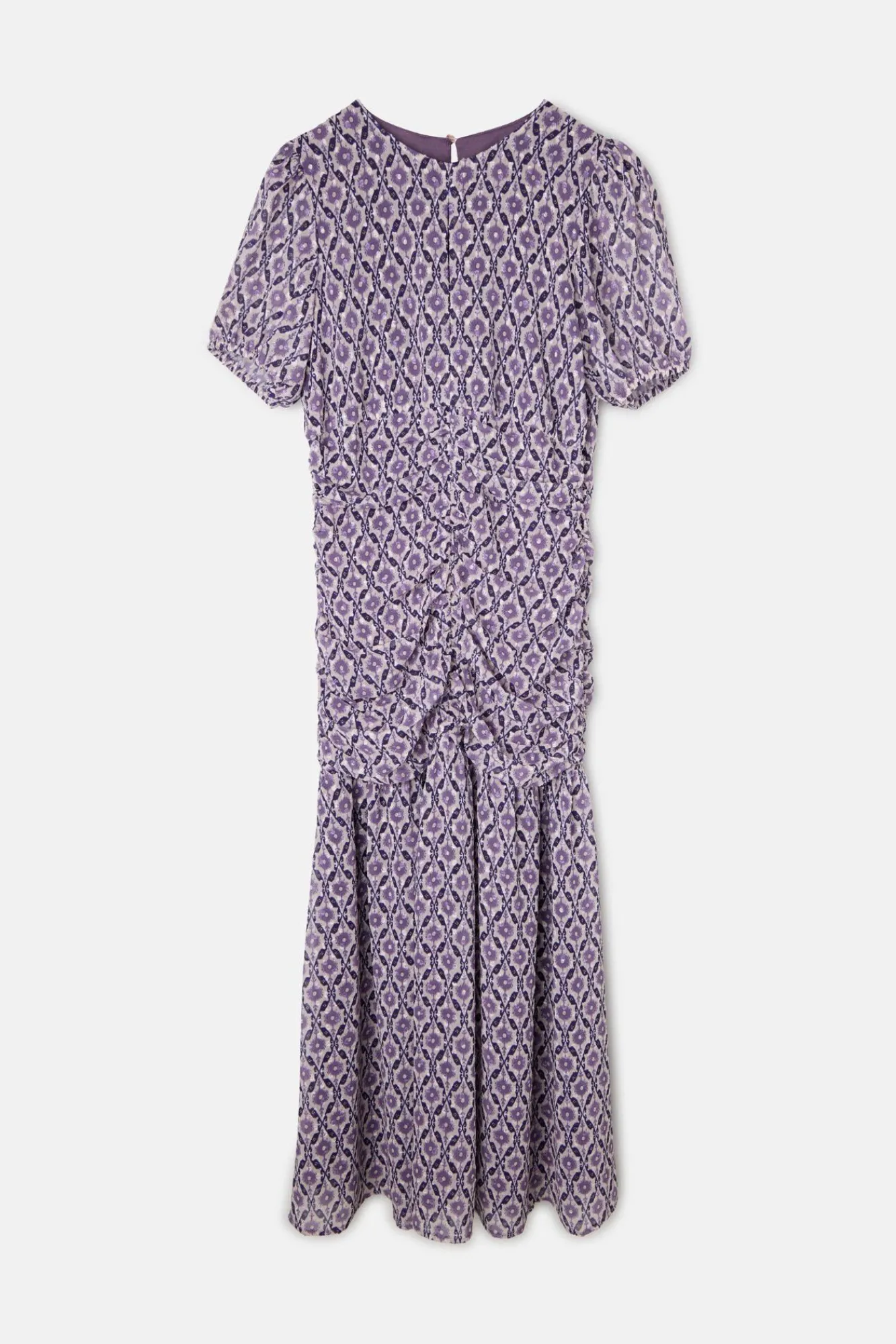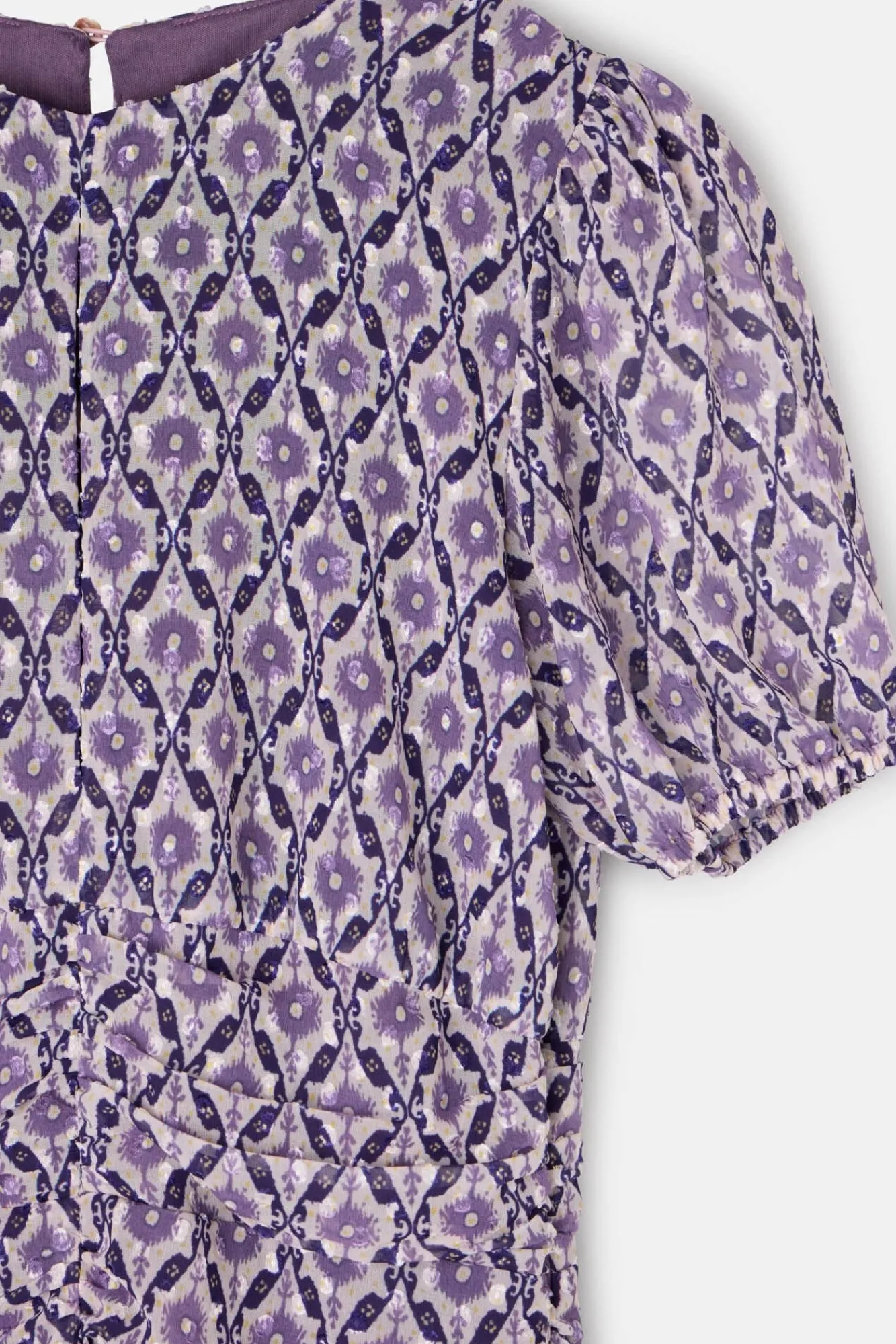 – Possui decote redondo em formato de lágrima, franzido na frente e manga curtas bufantes