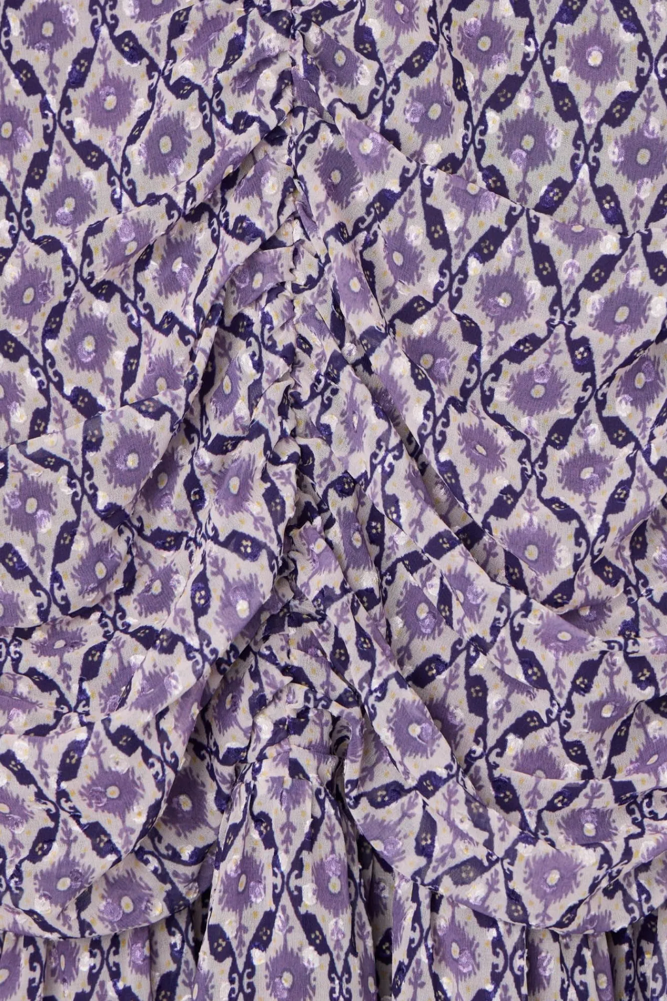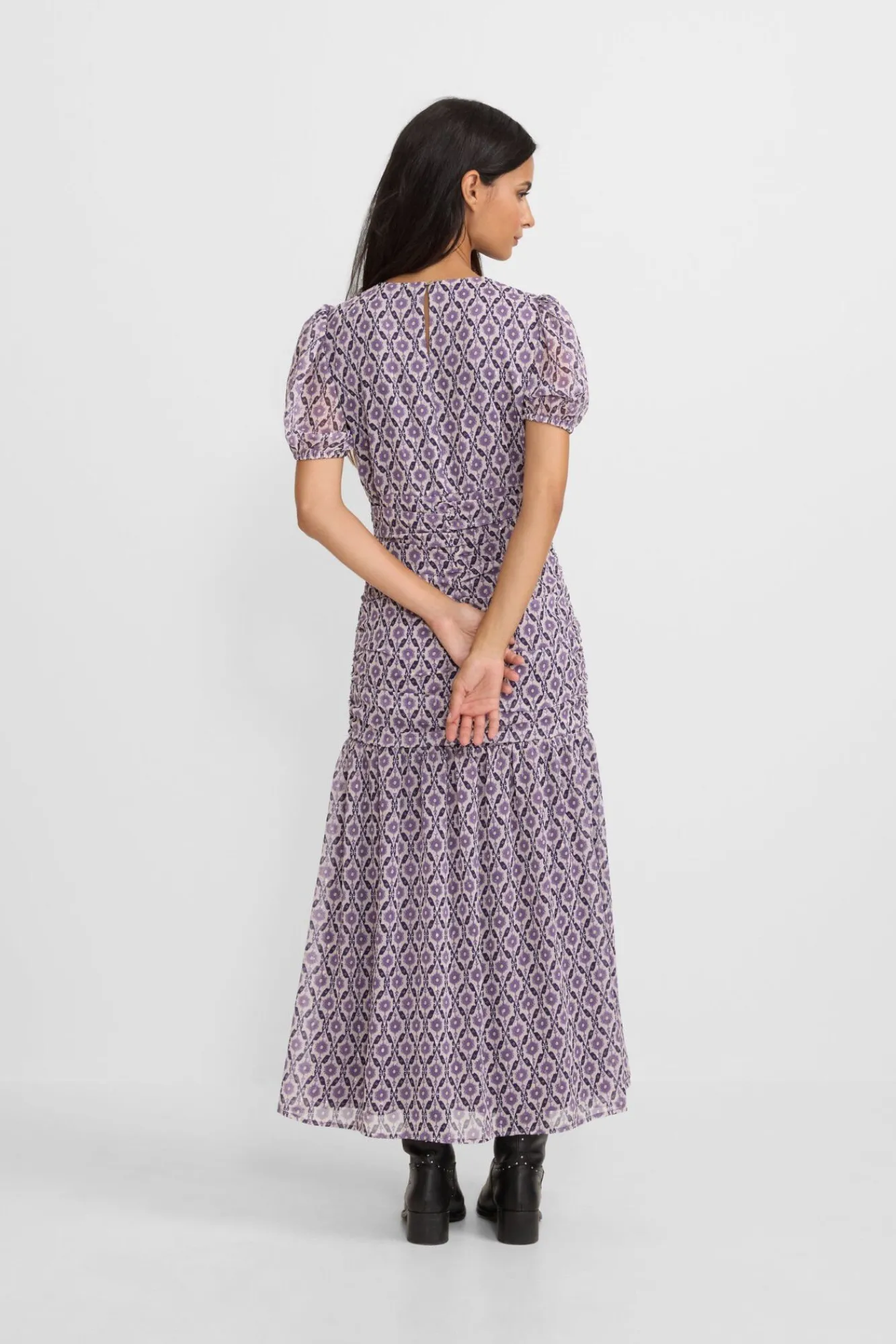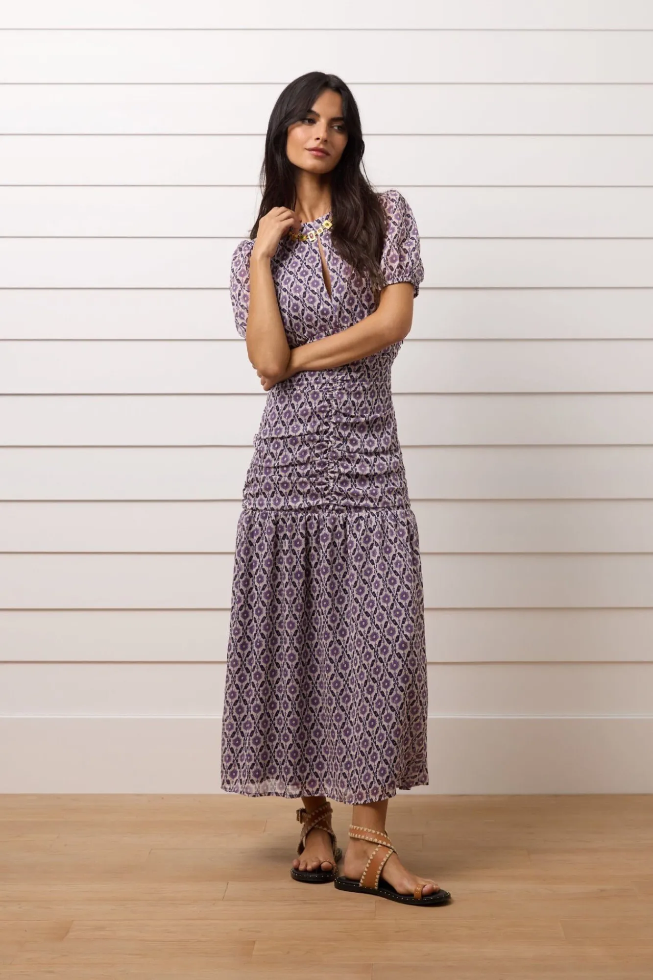– Possui decote redondo em formato de lágrima, franzido na frente e manga curtas bufantes