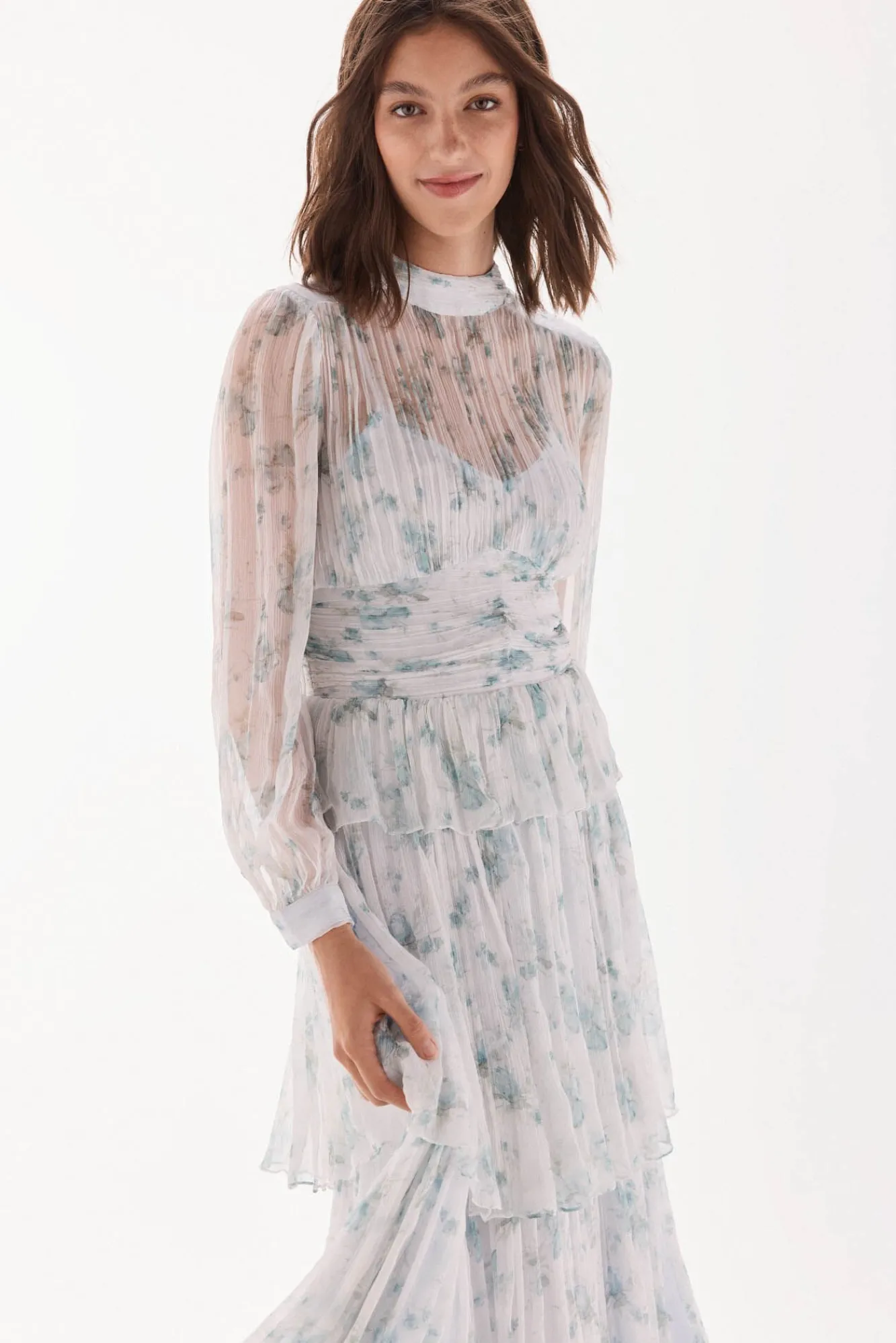 – Vestido em decote caixa A com gola, em chiffon transparente com mangas e punhos fluidos