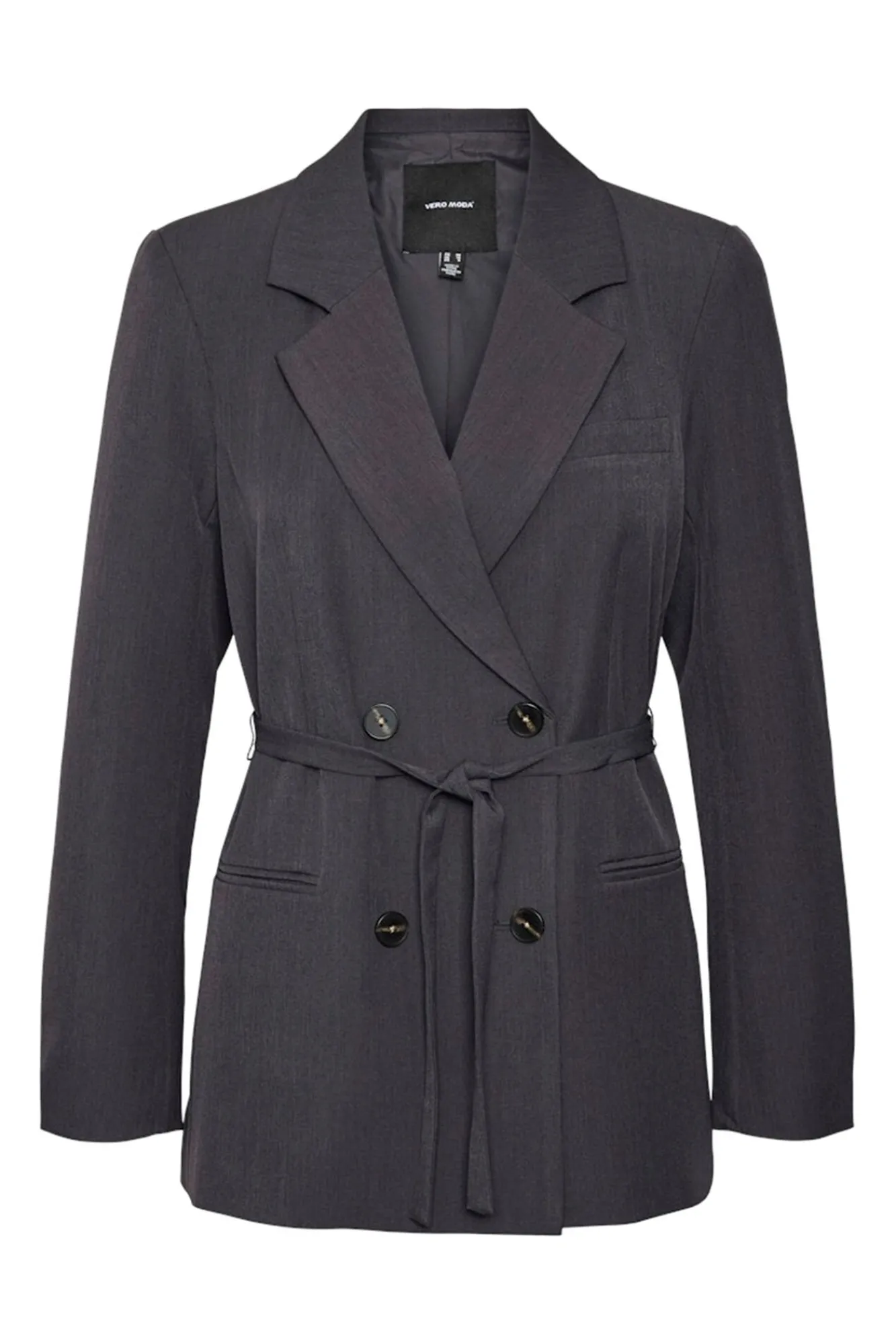 – Detalhe de cinto ajustável e fecho frontal com quatro botões.