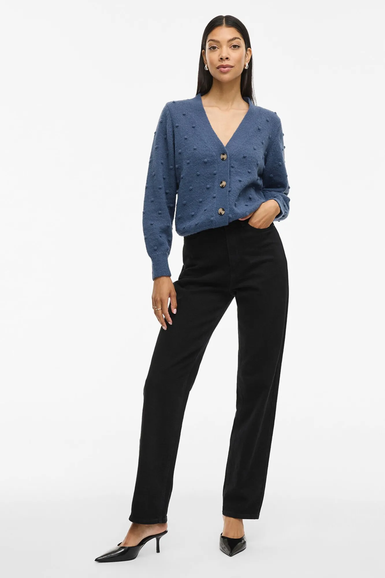– Decote em V com fecho de botão frontal