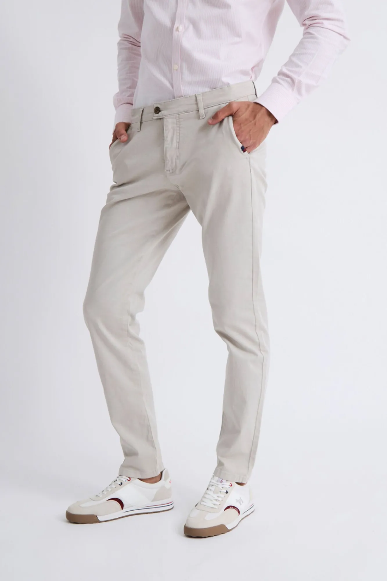 – No bolso lateral, um sutil detalhe de bandeira bicolor adiciona um toque único de cor, enquanto os bolsos traseiros são finalizados com botões personalizados, refletindo um cuidado meticuloso em cada detalhe
