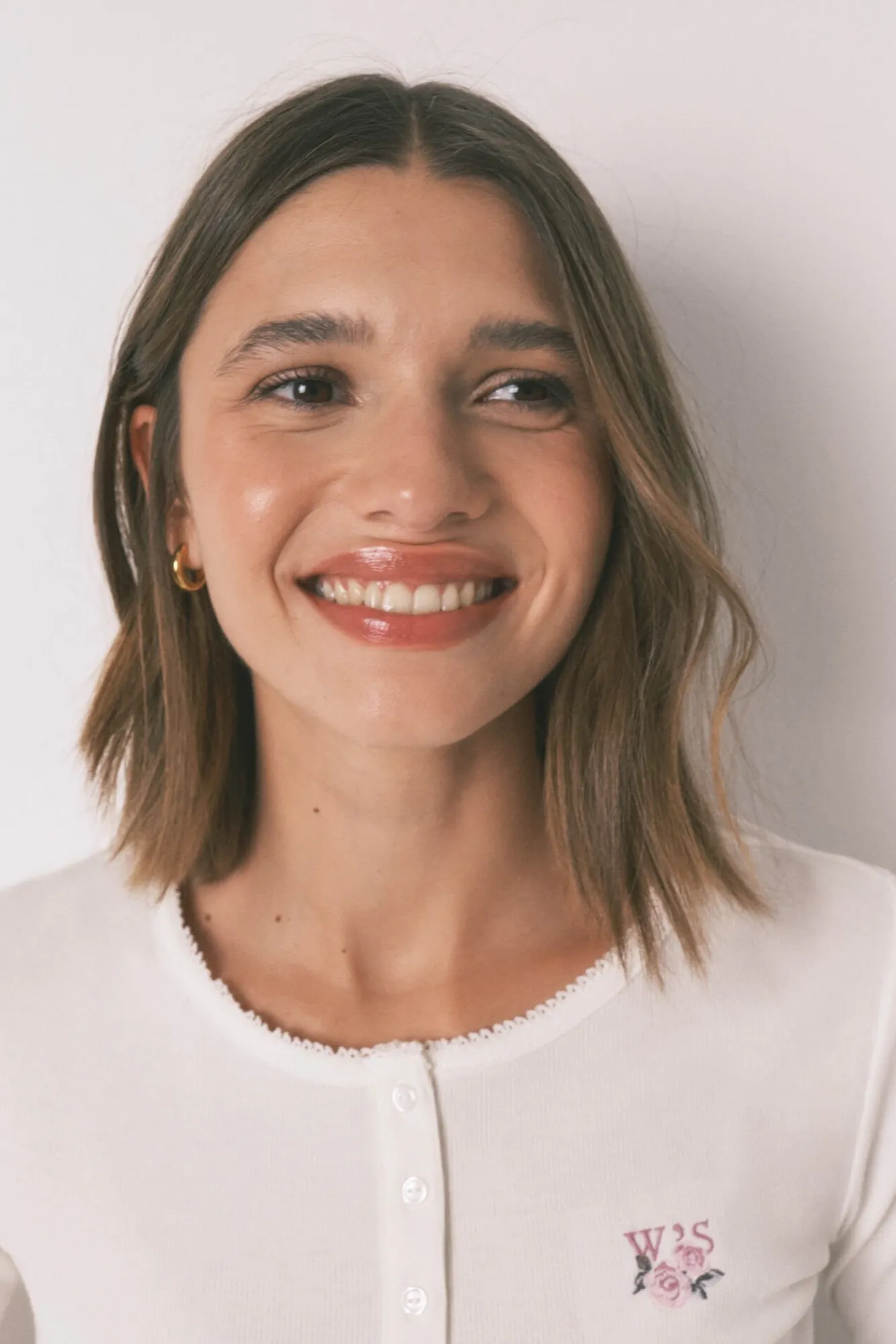 – Top liso com decote redondo e acabamento em renda decorativa, carcela com carcela central e botões a condizer e pequeno bordado floral no peito.
