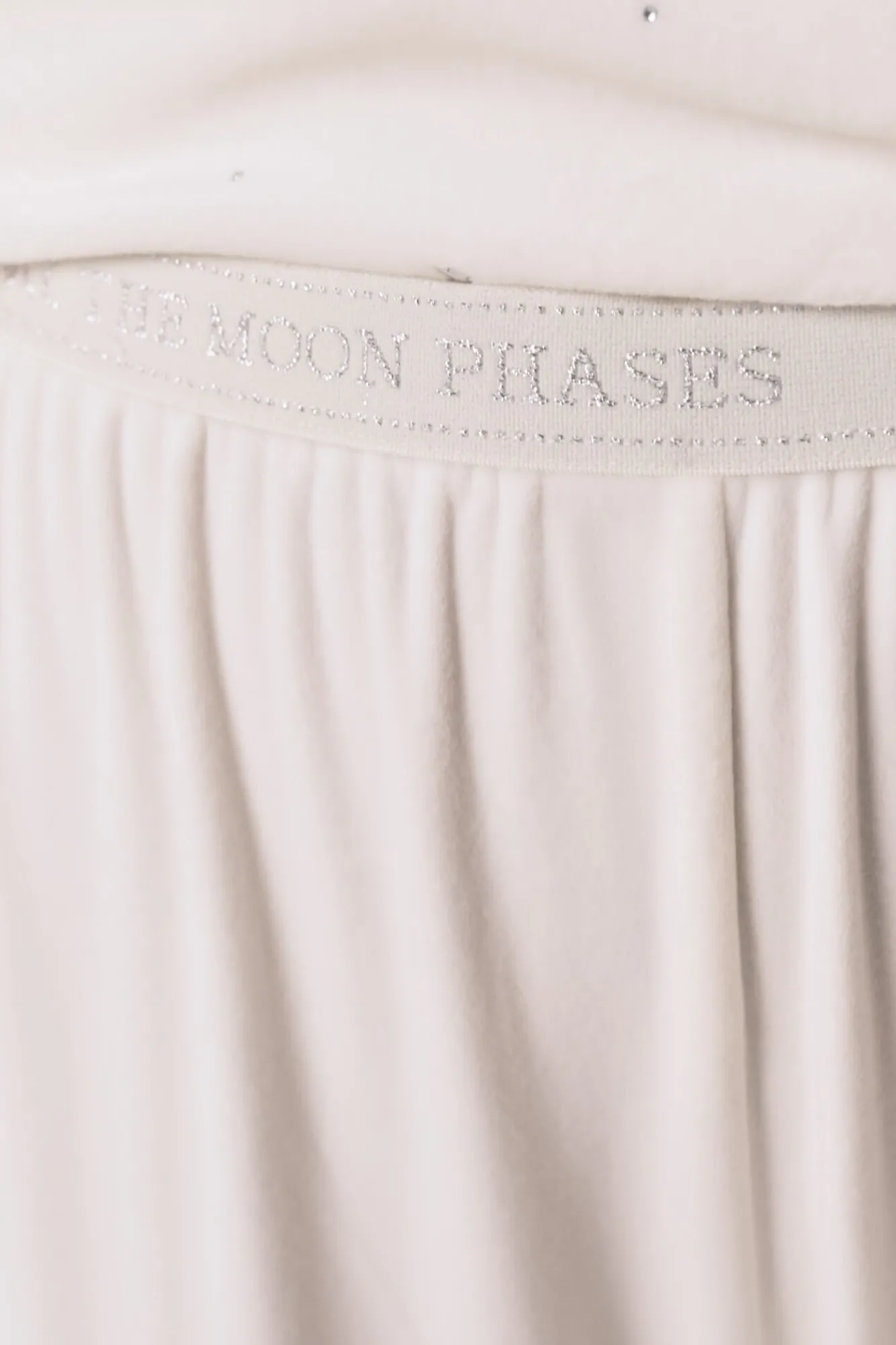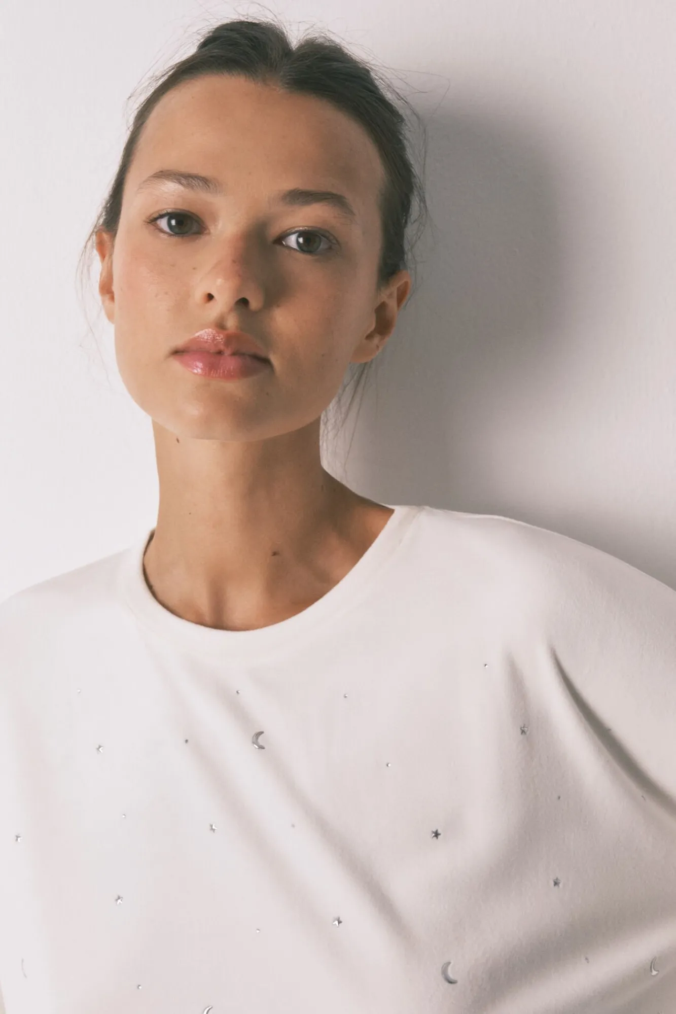 – Top com strass metálicos em formato de luas e estrelas, decote redondo, manga caídas e cós ajustável com fita combinando.