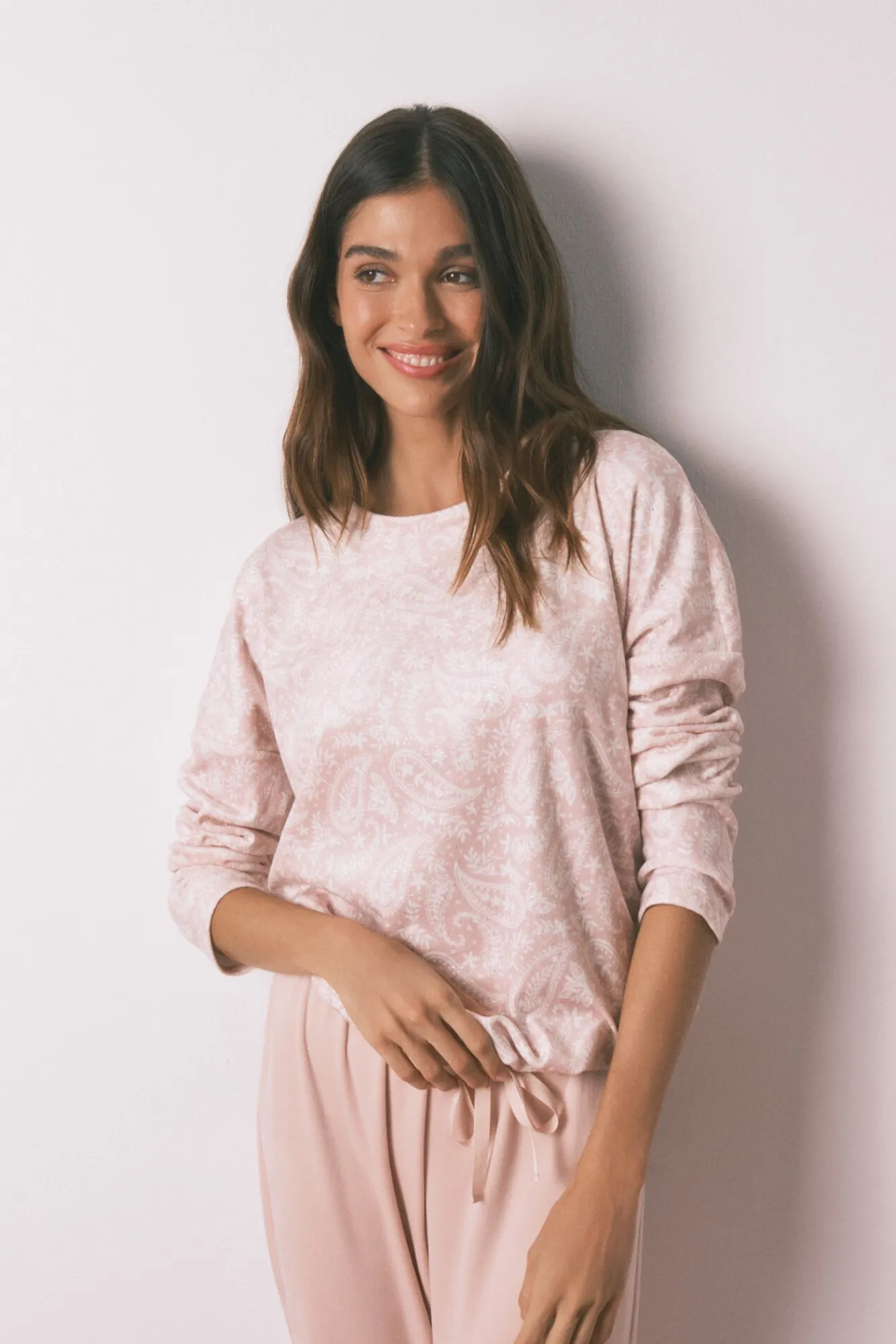 – Top com estampado paisley e detalhe de glitter, decote redondo, manga caídas e cós ajustável com fita combinando.