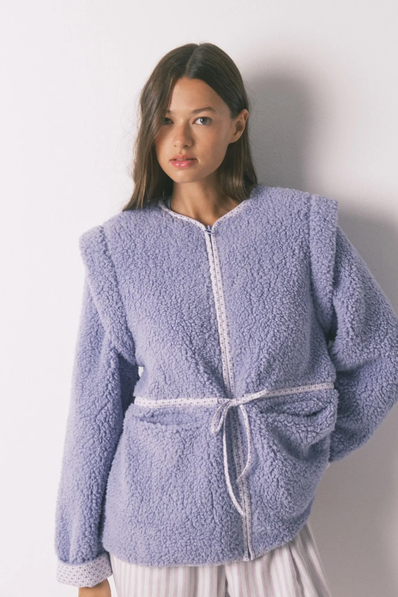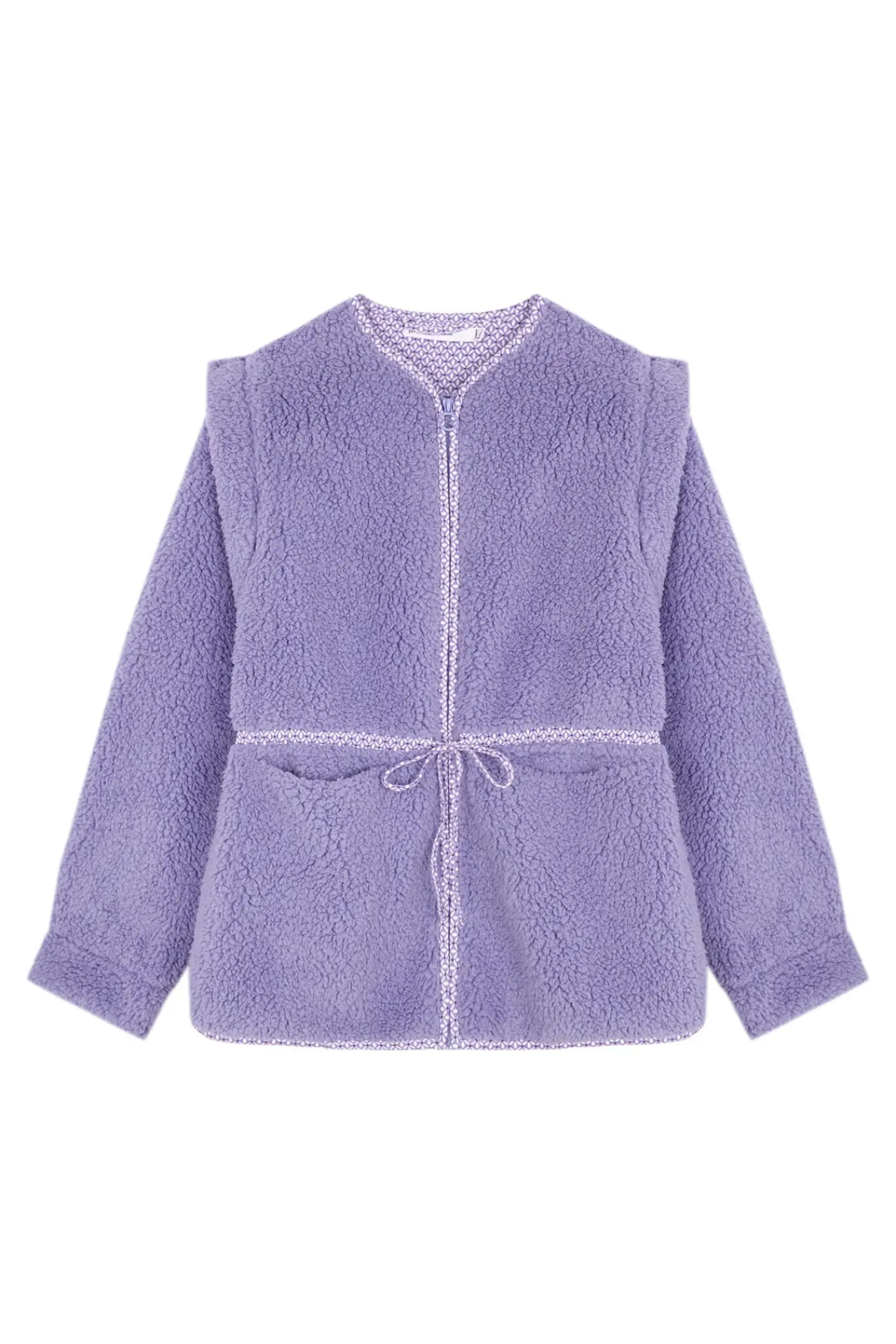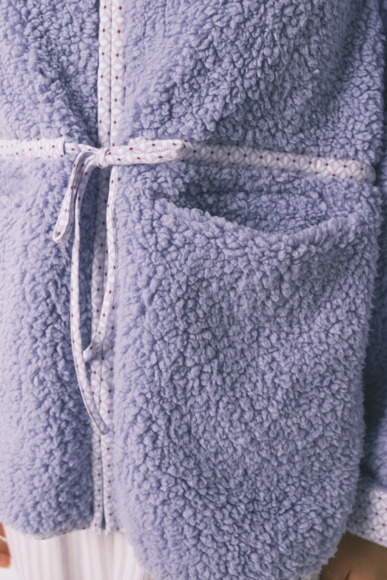 – Pode ser amarrado com fita combinando na cintura e nos bolsos laterais.