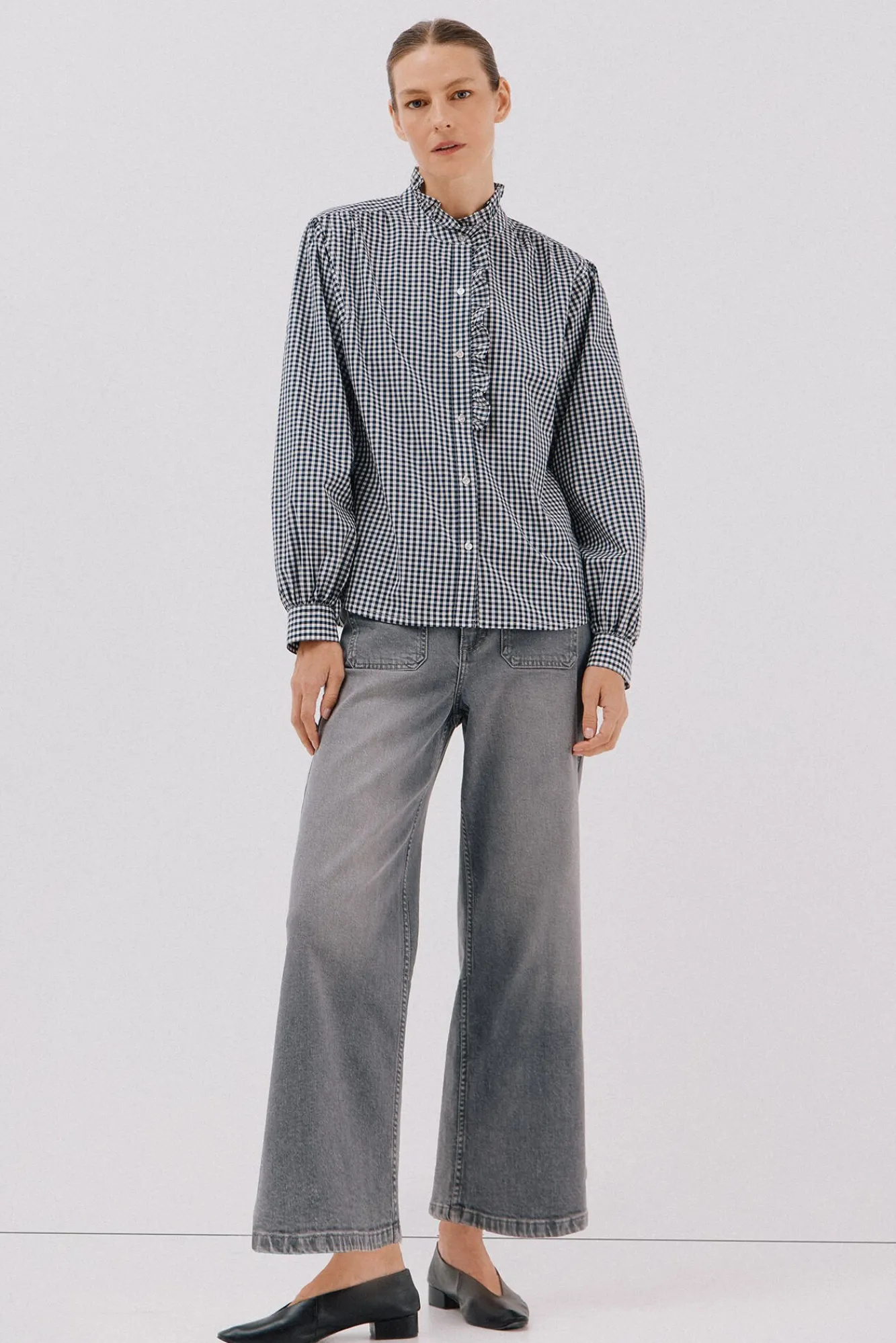 – Fechamento frontal por botões com detalhe de folho