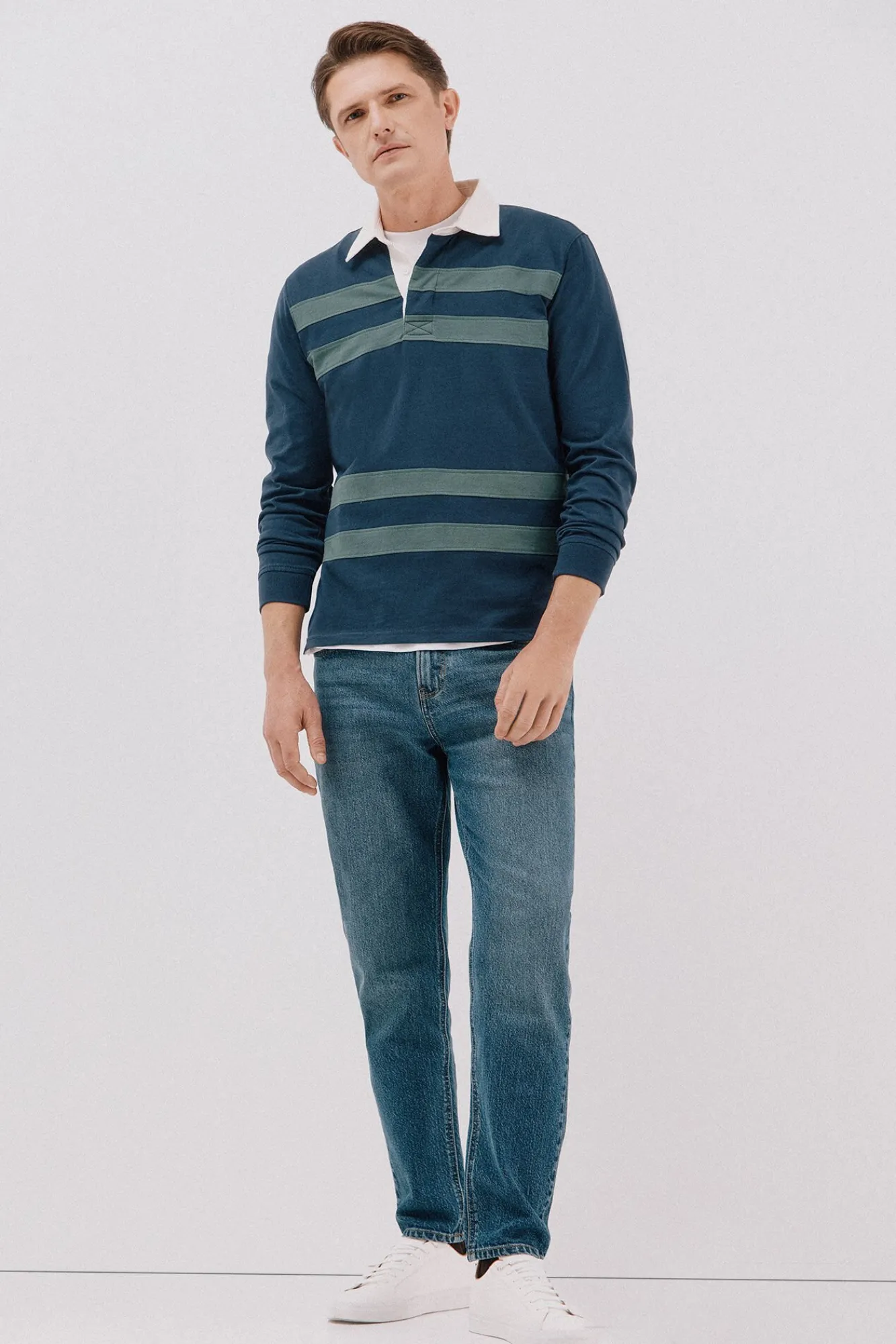 -Gola branca contrastante, riscas de cor contrastante e carcela de botões