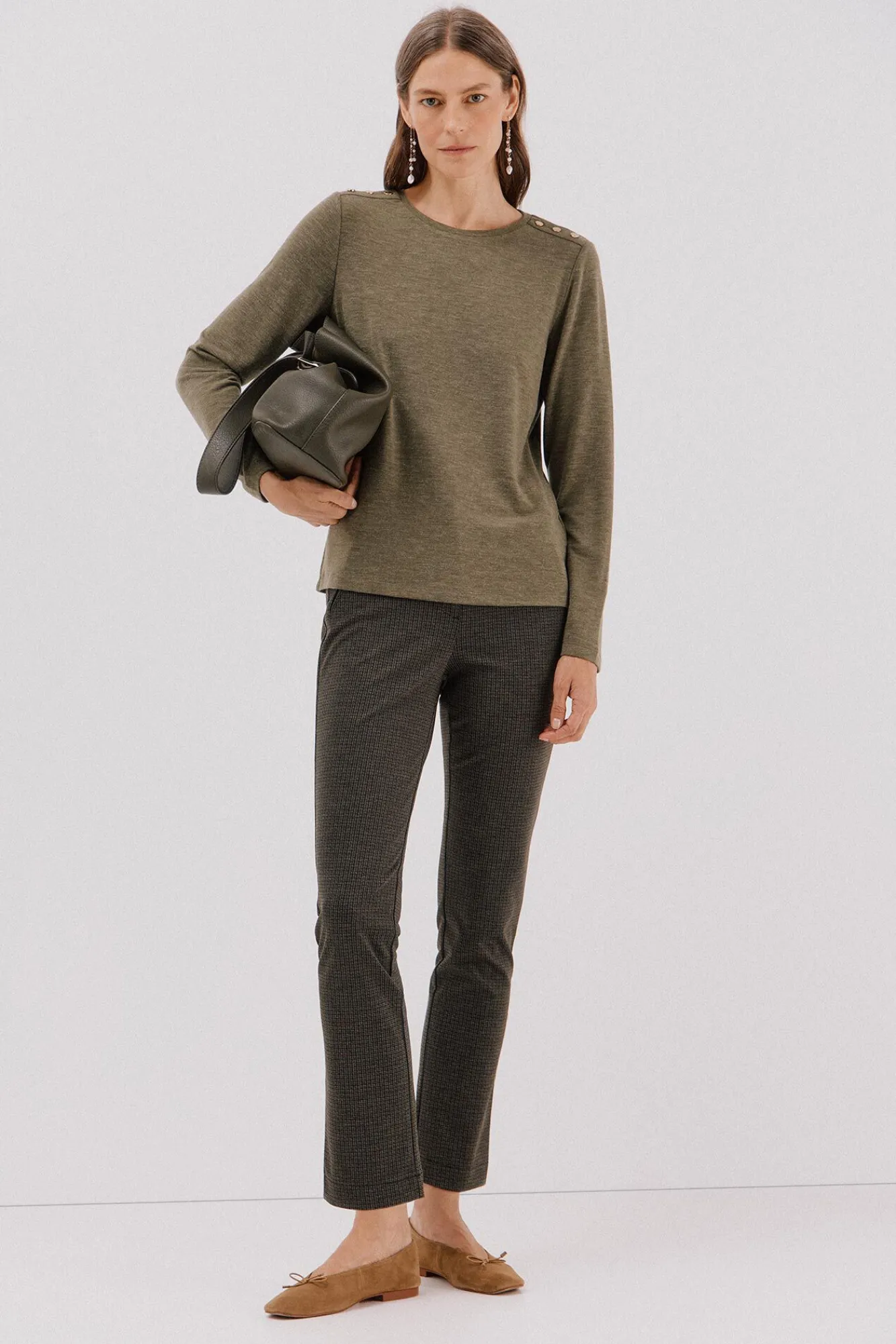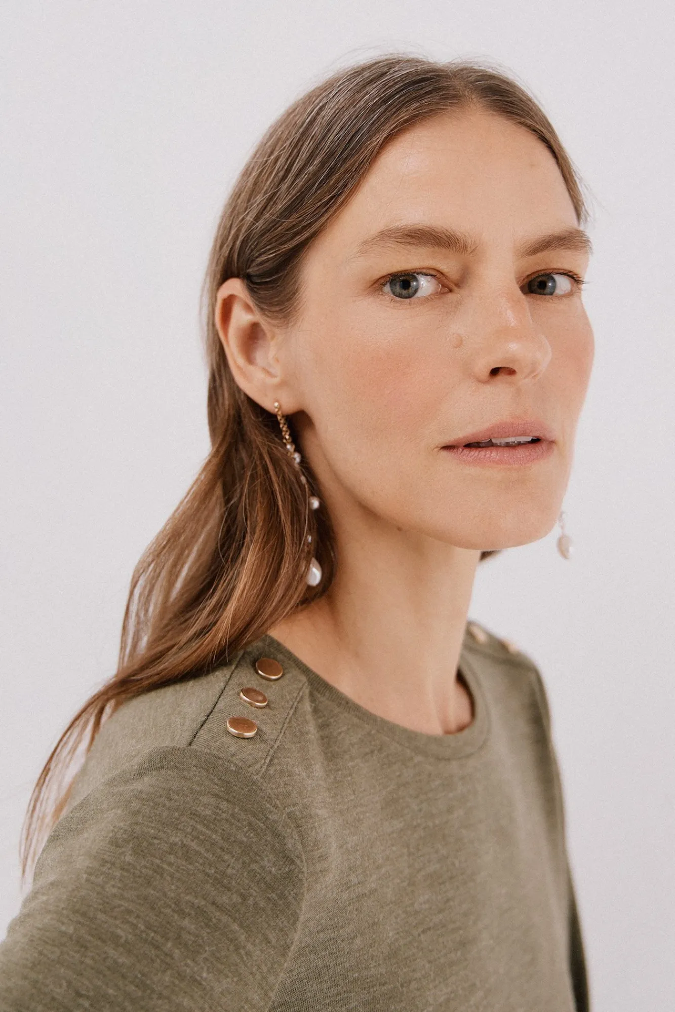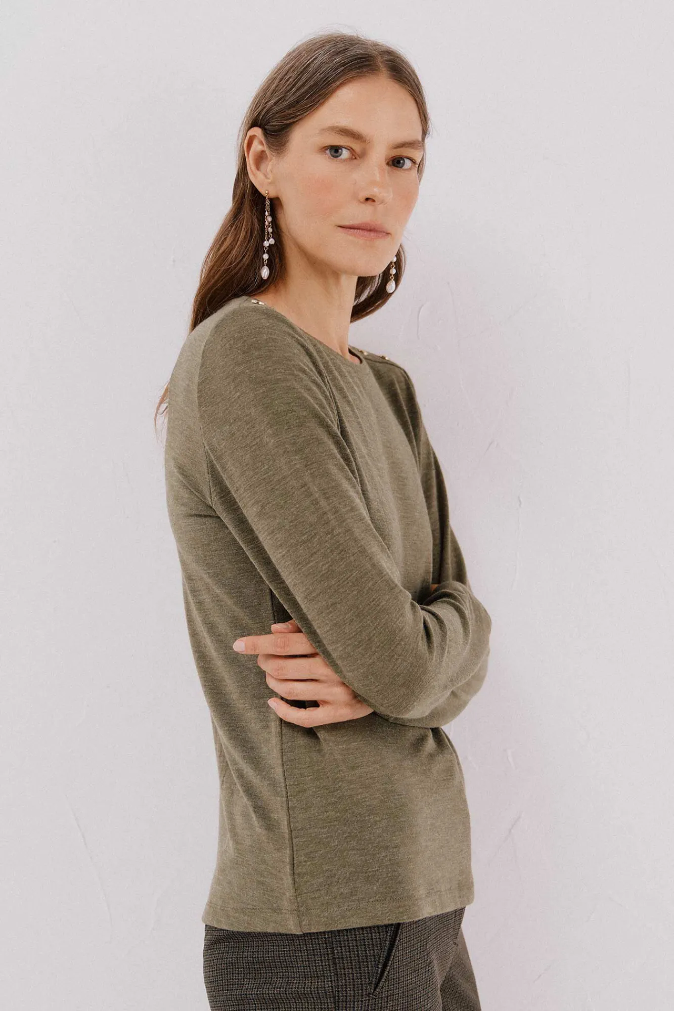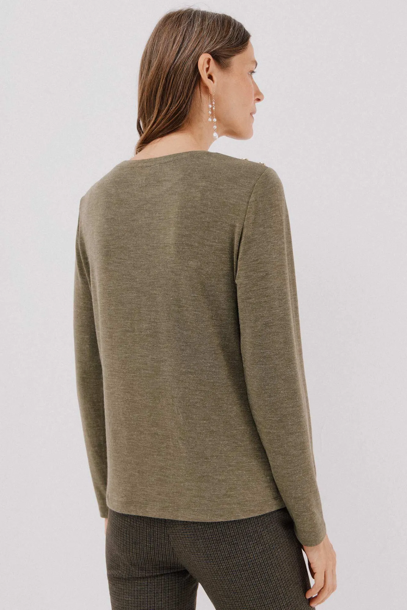 -Decote redondo com botões dourados no ombro