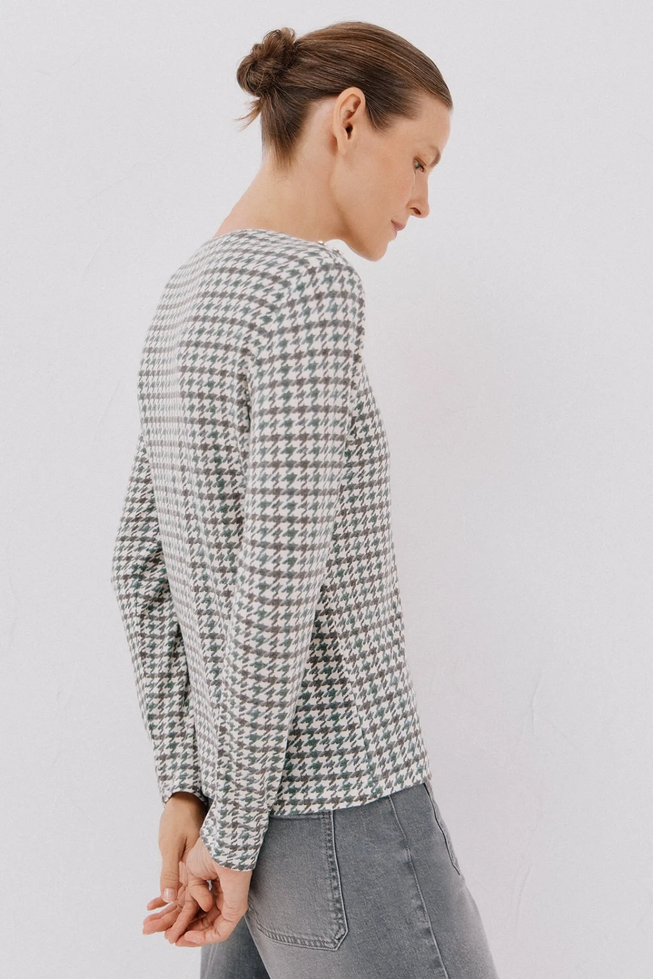 -Decote redondo com botões dourados no ombro