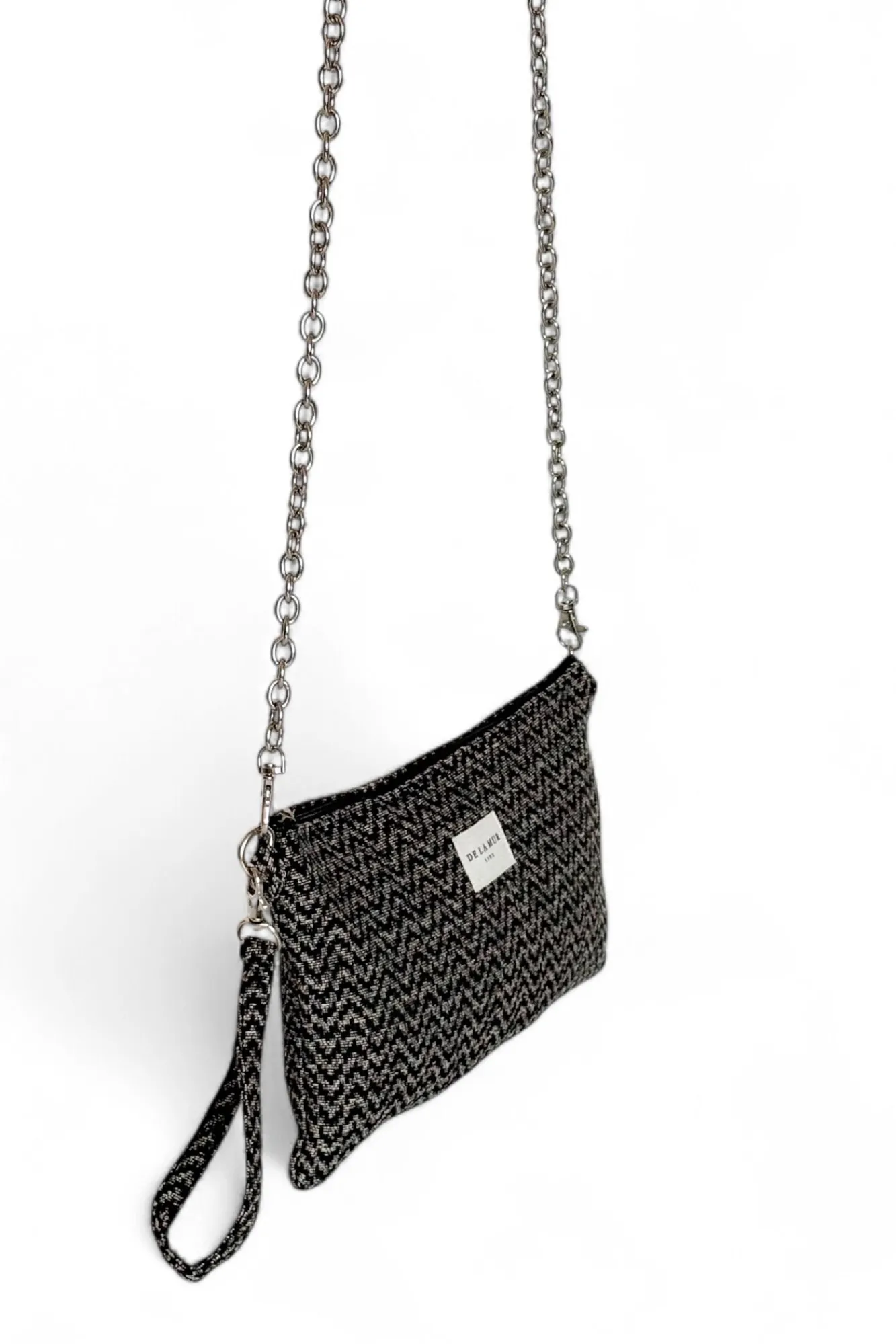 Mala clutch com alça de corrente prateada e uma pequena alça lateral removível para uso no pulso. Confeccionada em tecido jacquard grosso com estampado em zigue-zague bege e preto. Interior forro e fecho-éclair de zíper. Para os devidos cuidados, recomendamos lavar em água fria e não usar secadora.