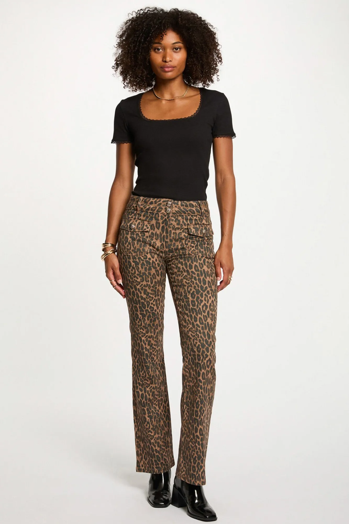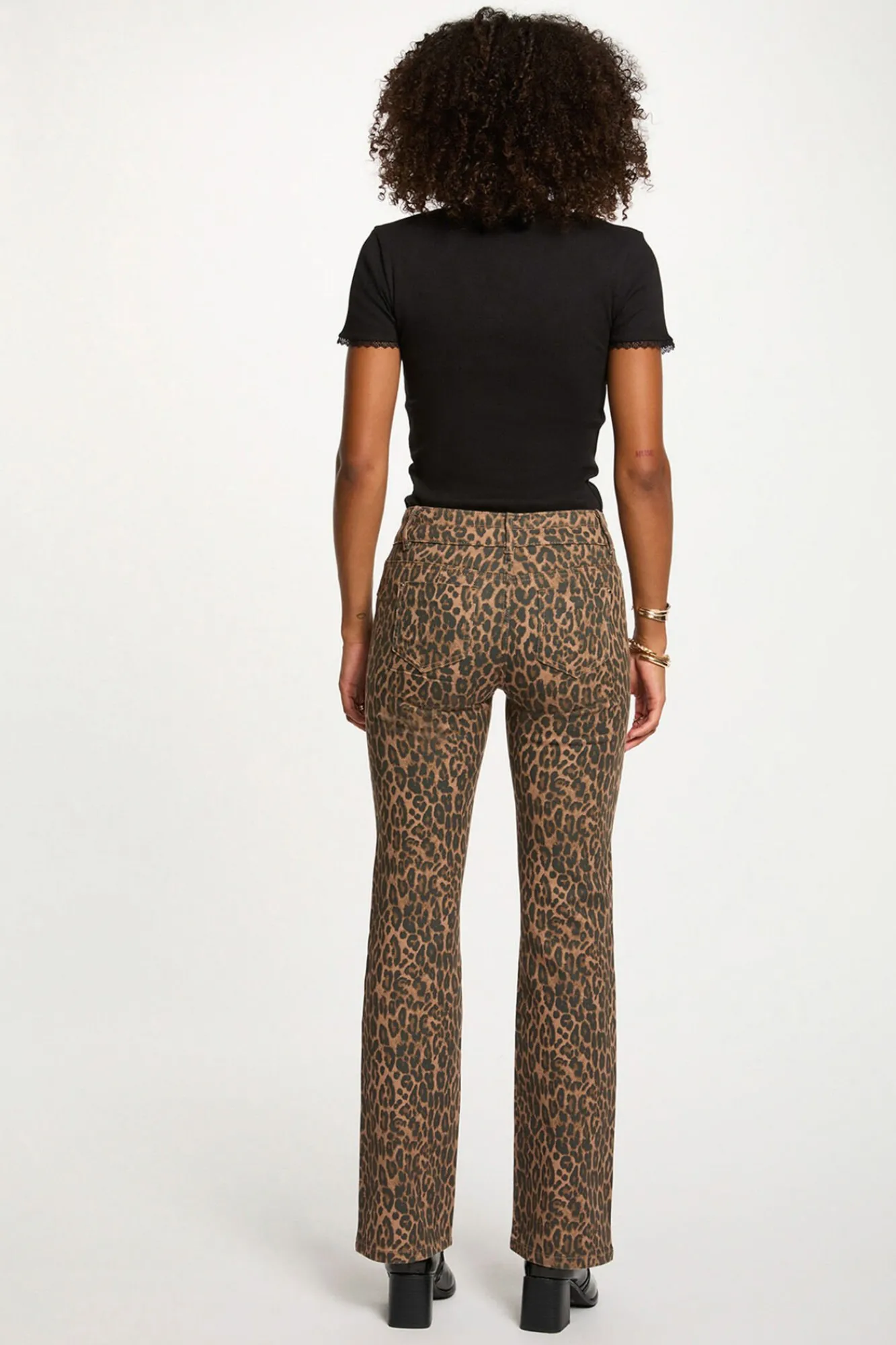 — As calça bootcut de cintura alta são combinadas com um top justo e botins de salto para uma silhueta feminina e confiante.