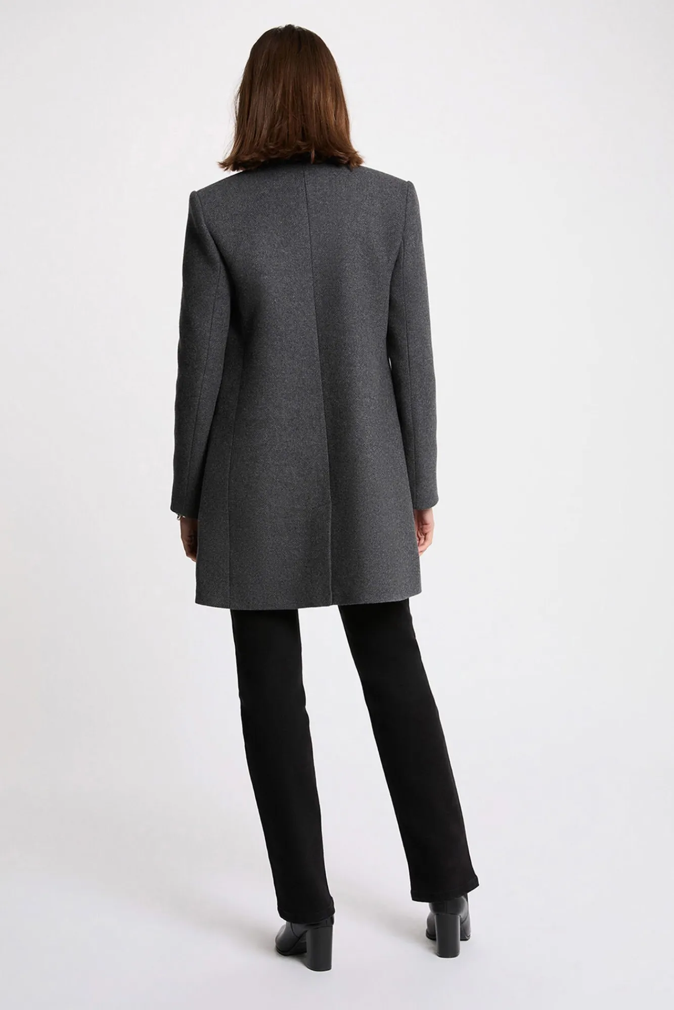 – O sobretudo slim valoriza um camisola texturizado e calça retas, complementados por botins de salto baixo para um look sofisticado.