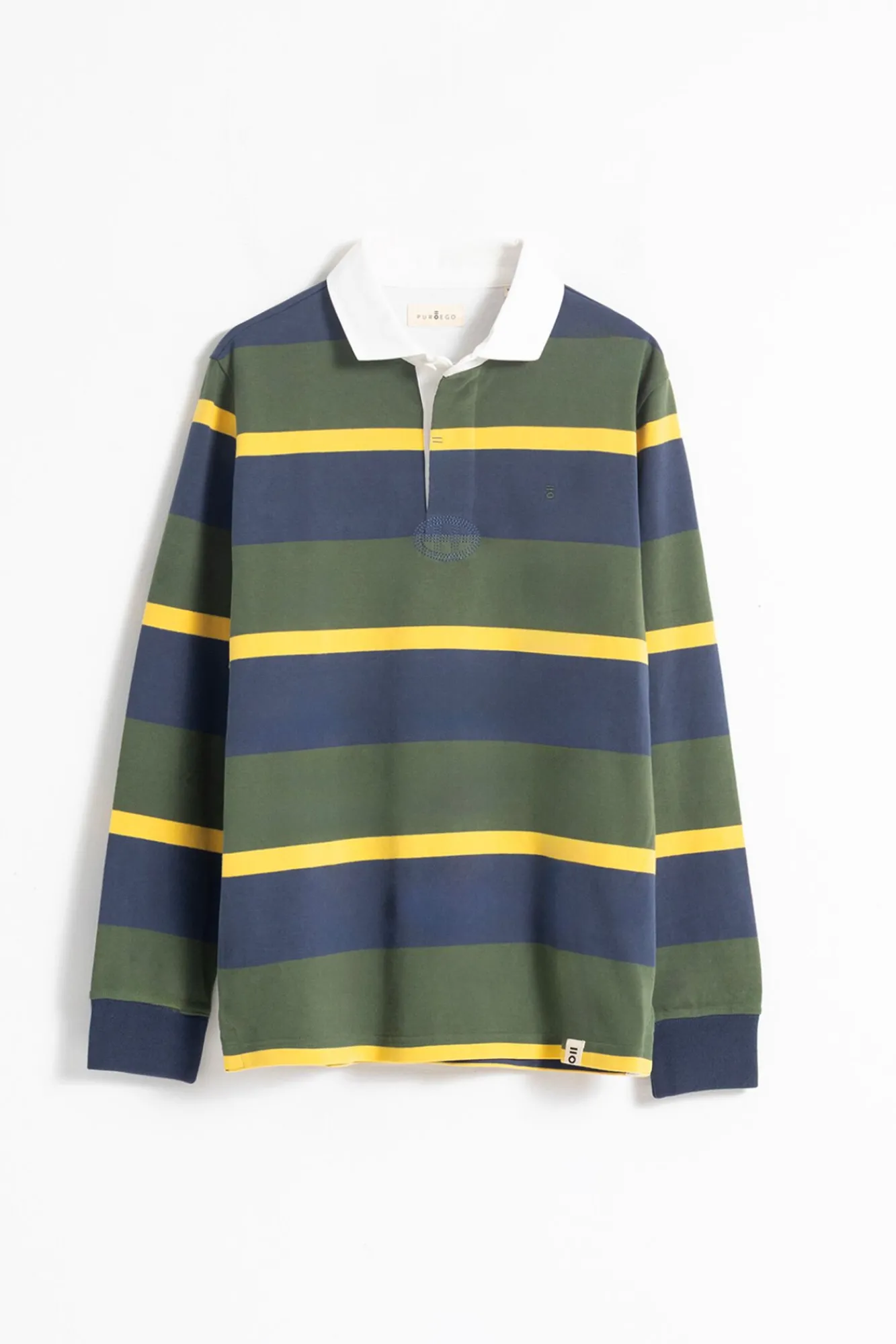 Logotipo contrastante localizado na altura do peito.
