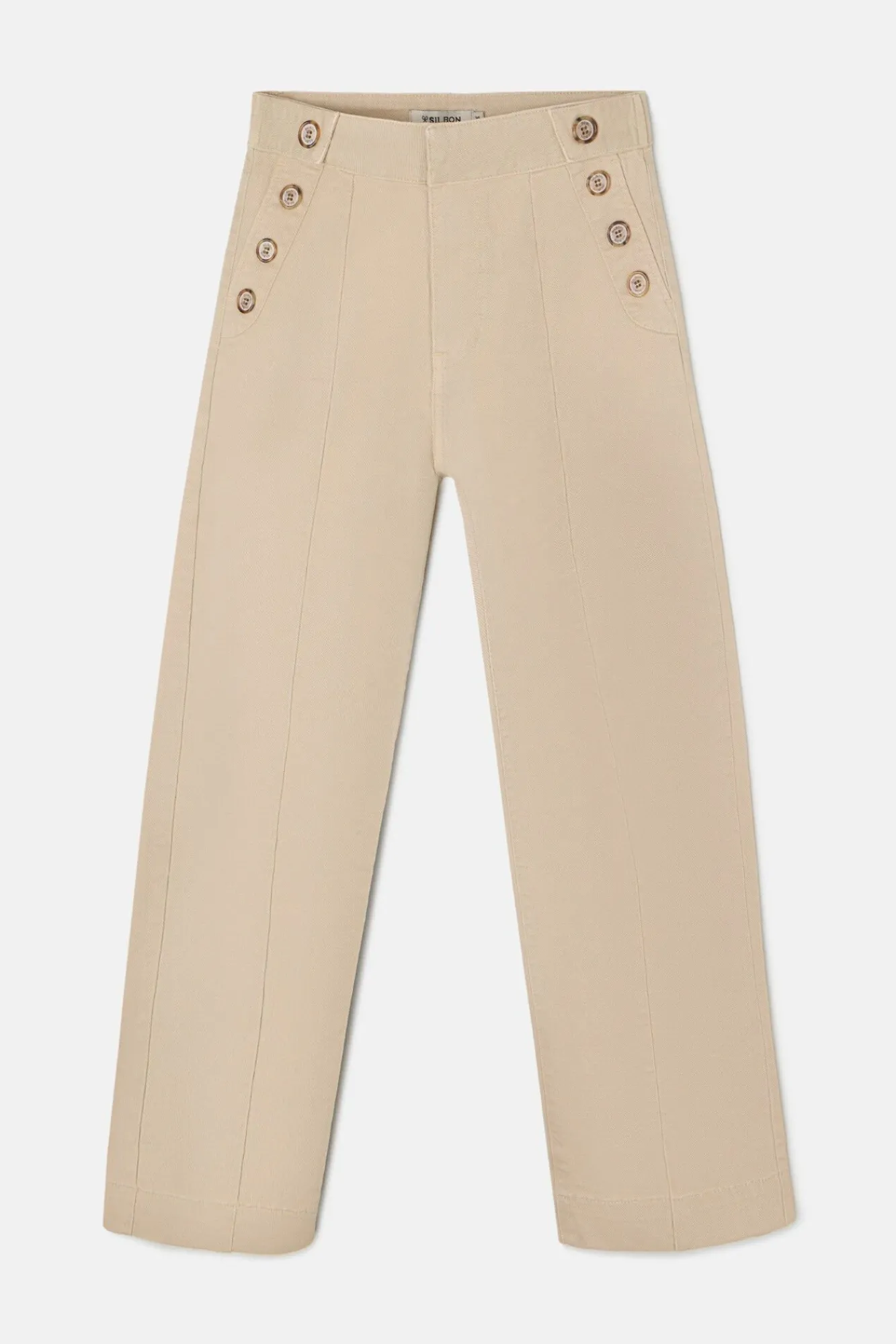 – Apresenta detalhes de costura decorativa com efeito de linha passada e bolsos laterais estilo calças chino
