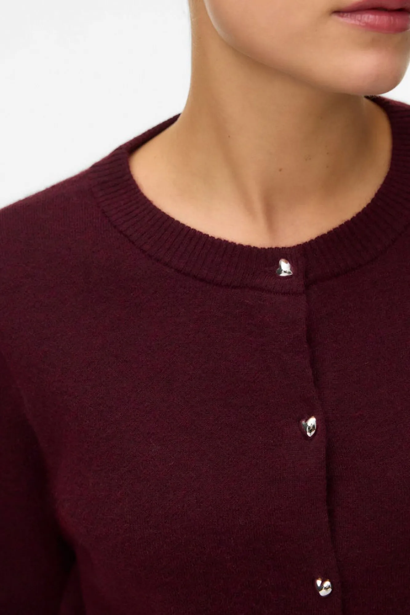 – Fecho frontal com botões de metal em formato de coração.