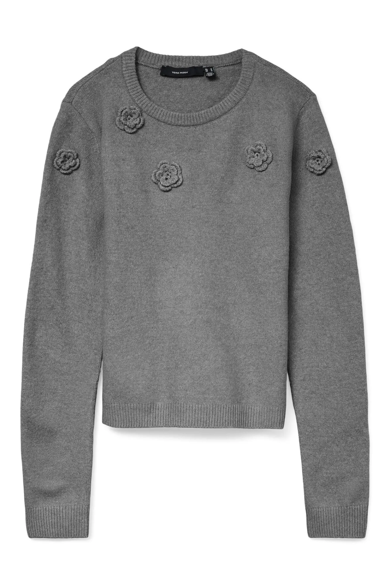 – Detalhes de flores 3D bordados no tecido.