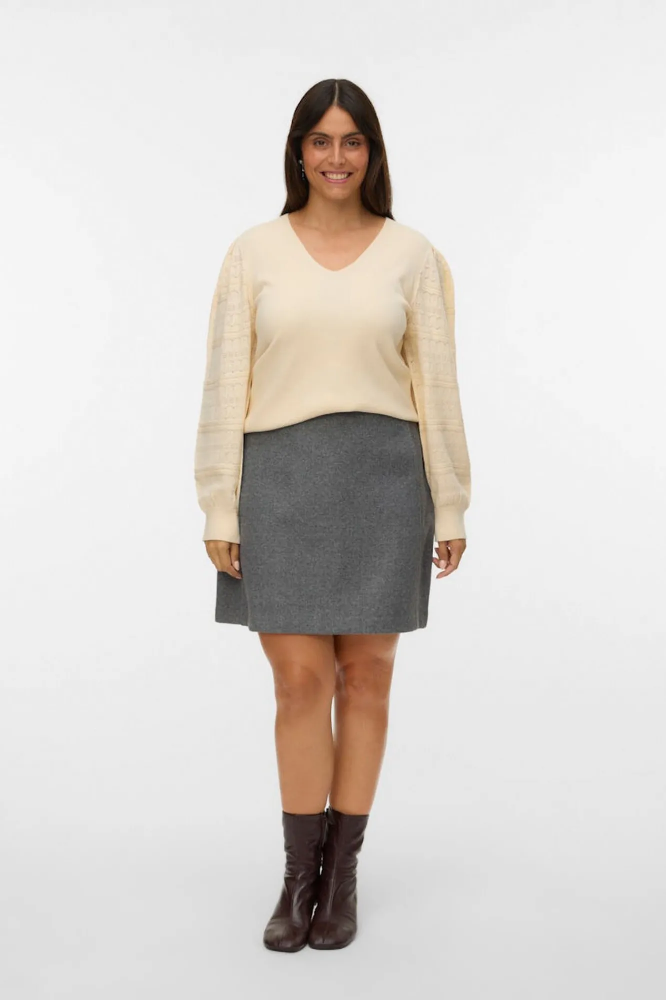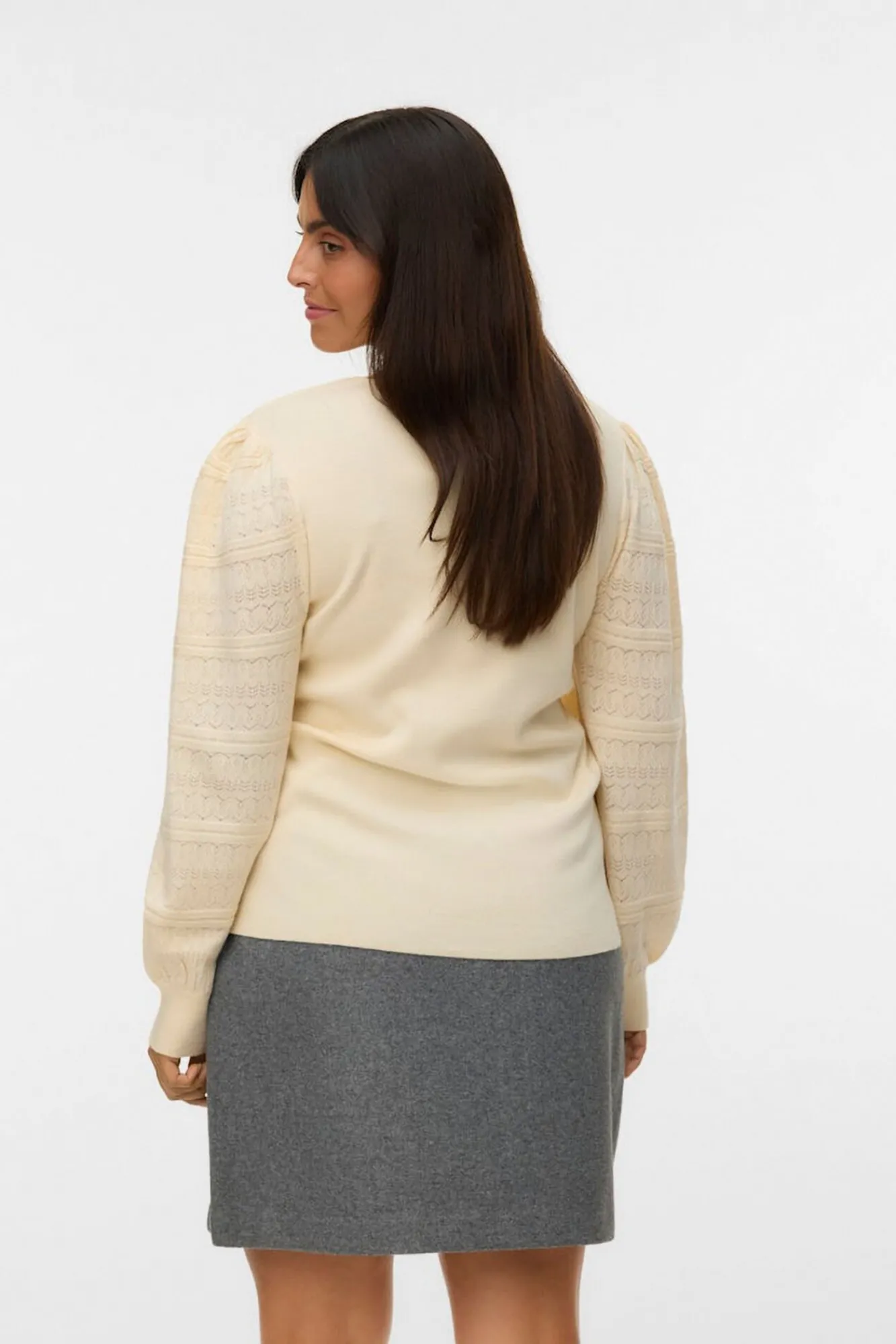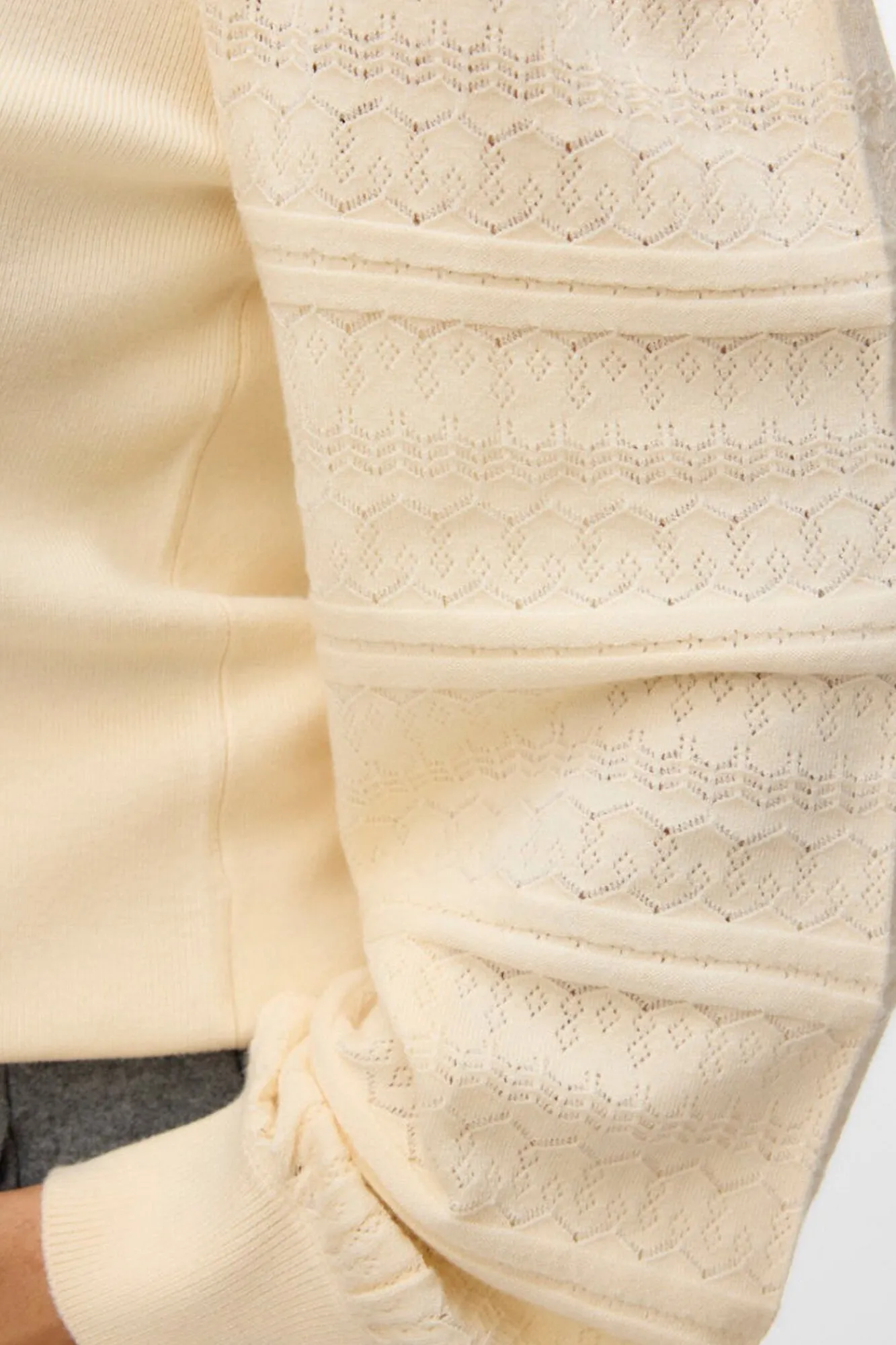 – Gola redonda e detalhe de acabamento na gola e nos punhos.