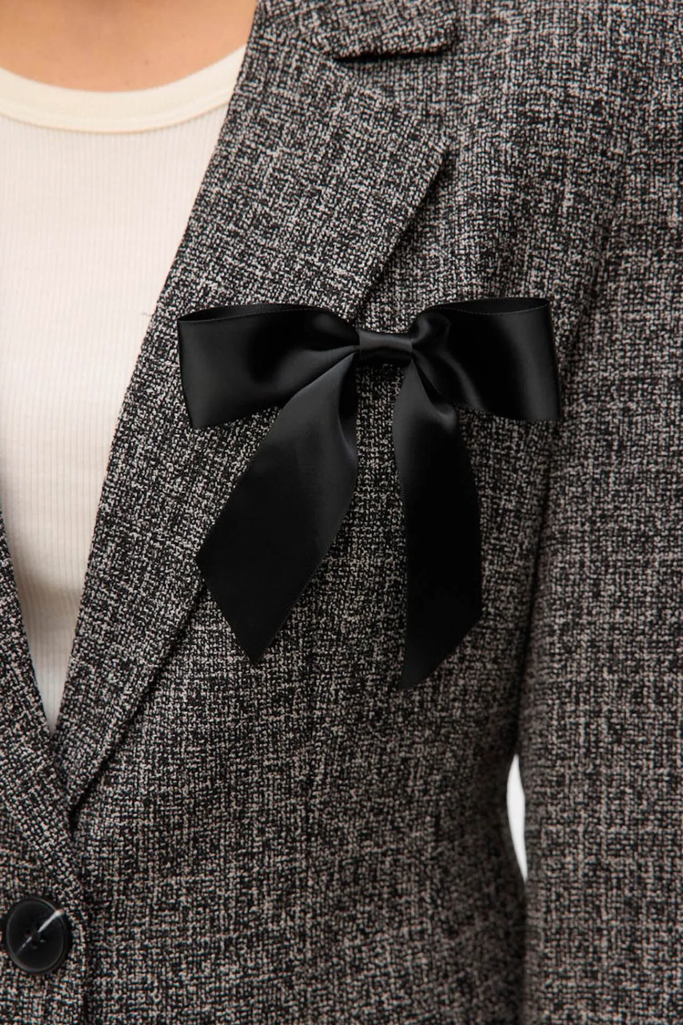 – Detalhe de laço de cetim no peito.
