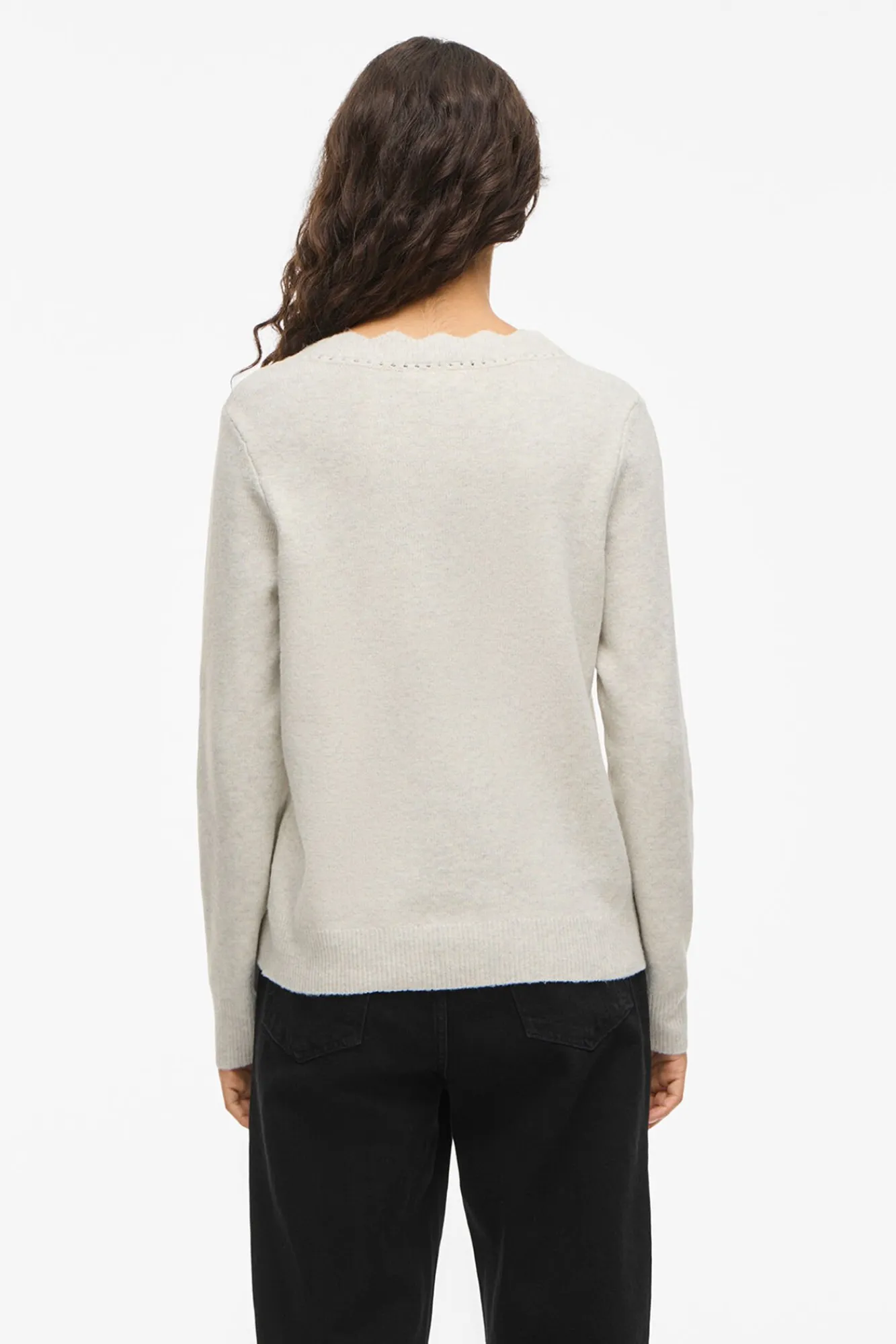 – Detalhe vazado e ondulado no decote em formato de camisola com gola em V