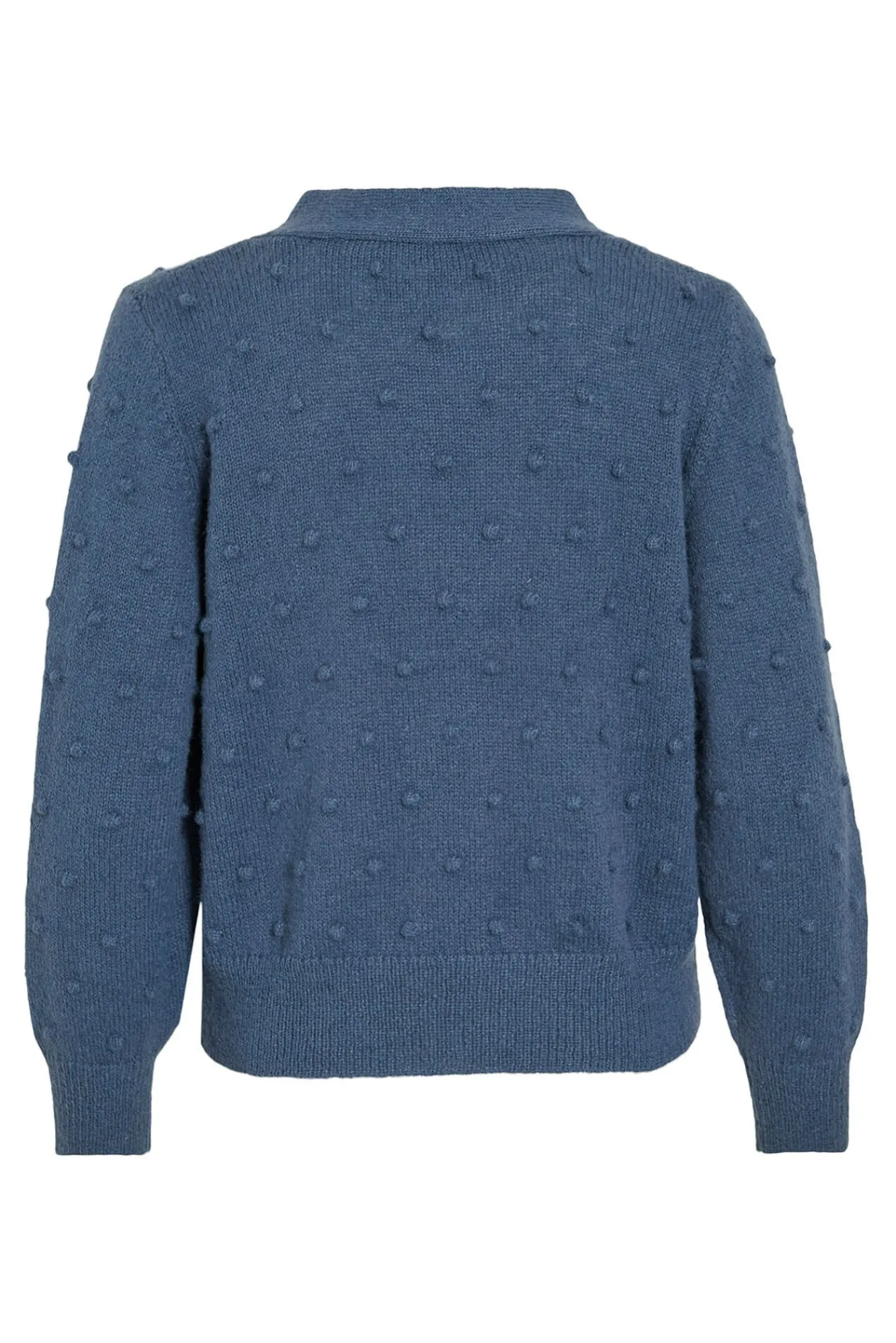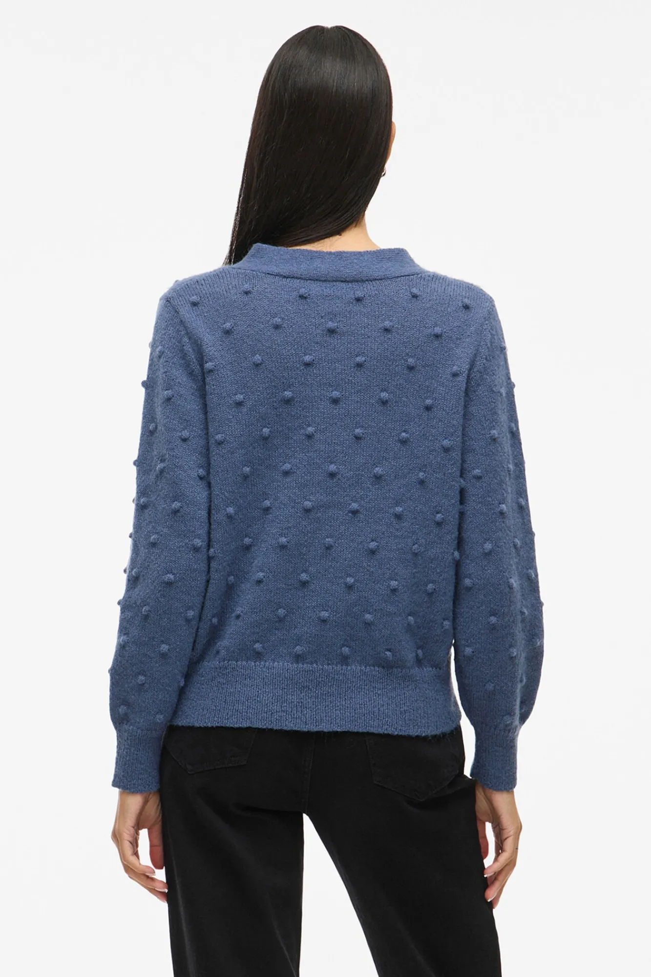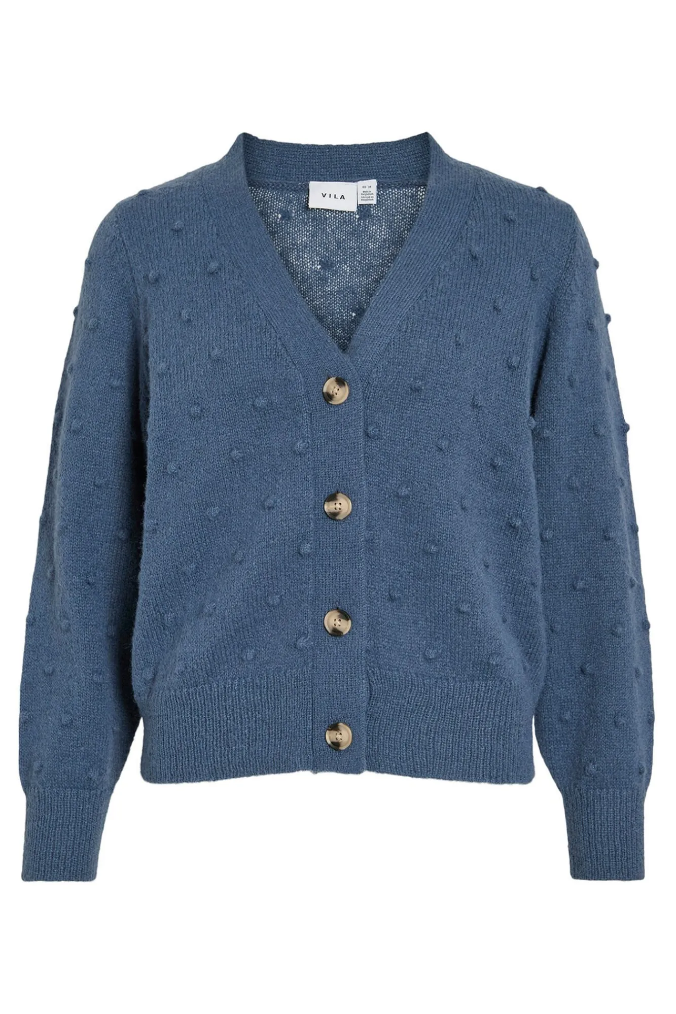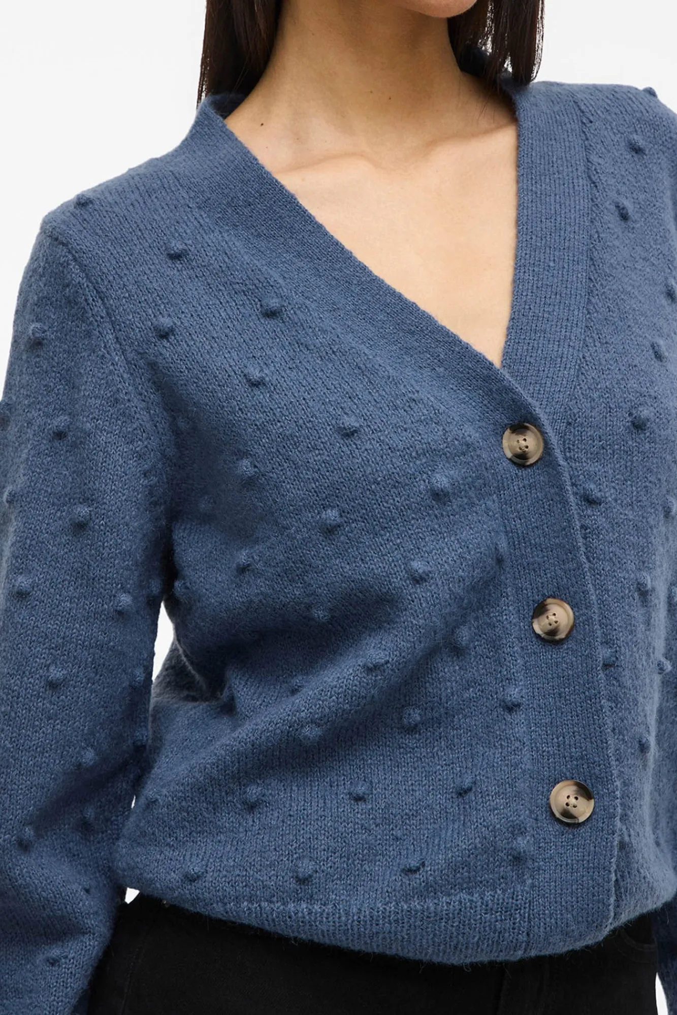 – Decote em V com fecho de botão frontal