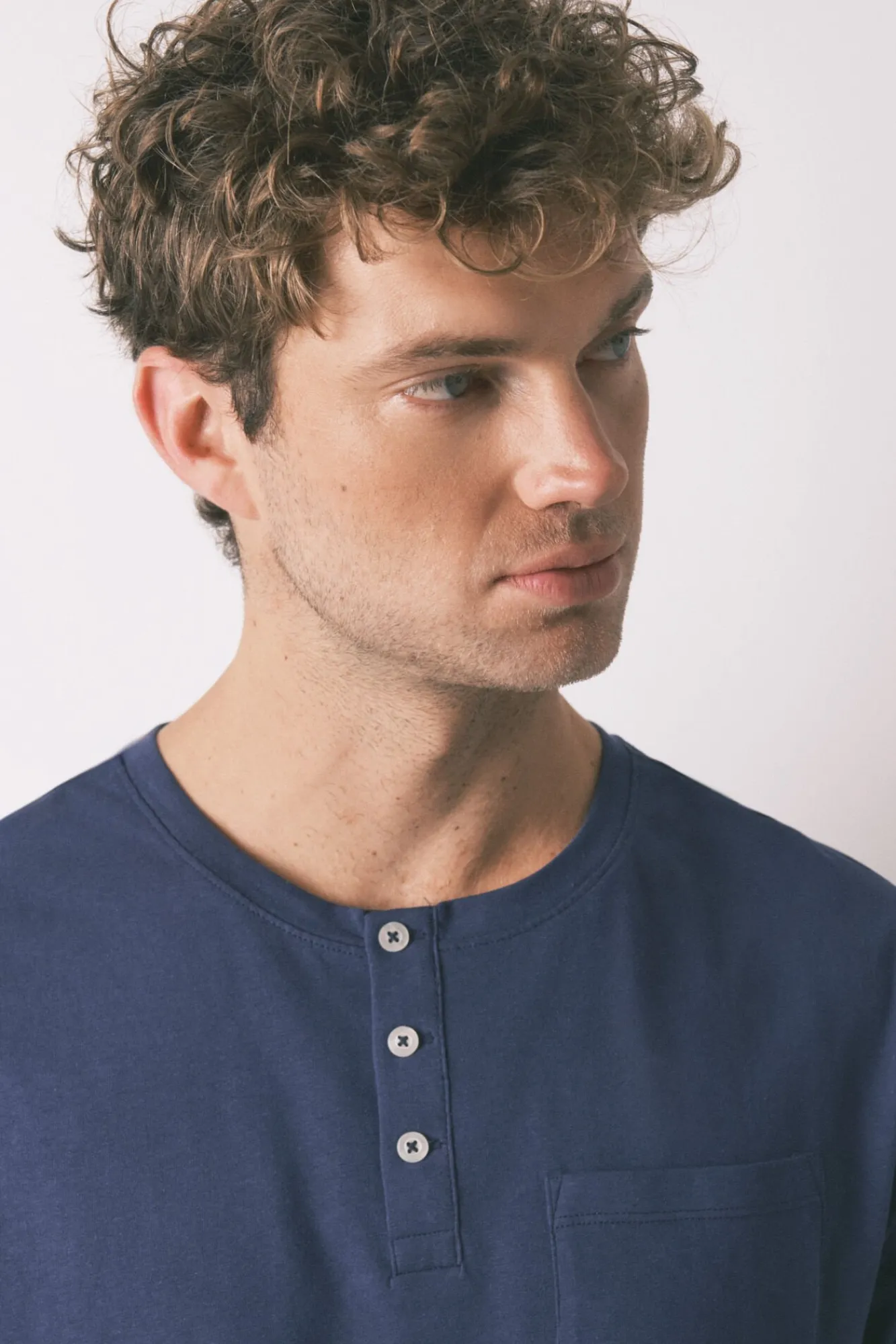 – T-shirt com gola redonda, carcela com botões e bolso de chapa no peito.
