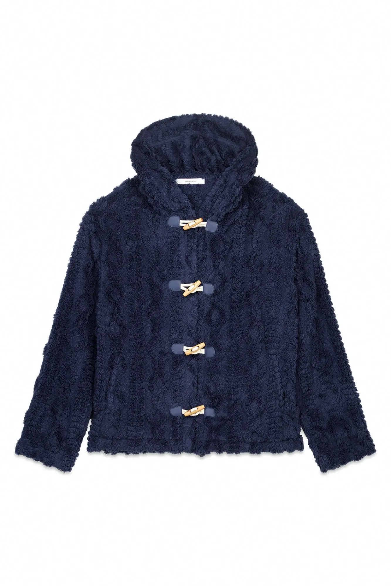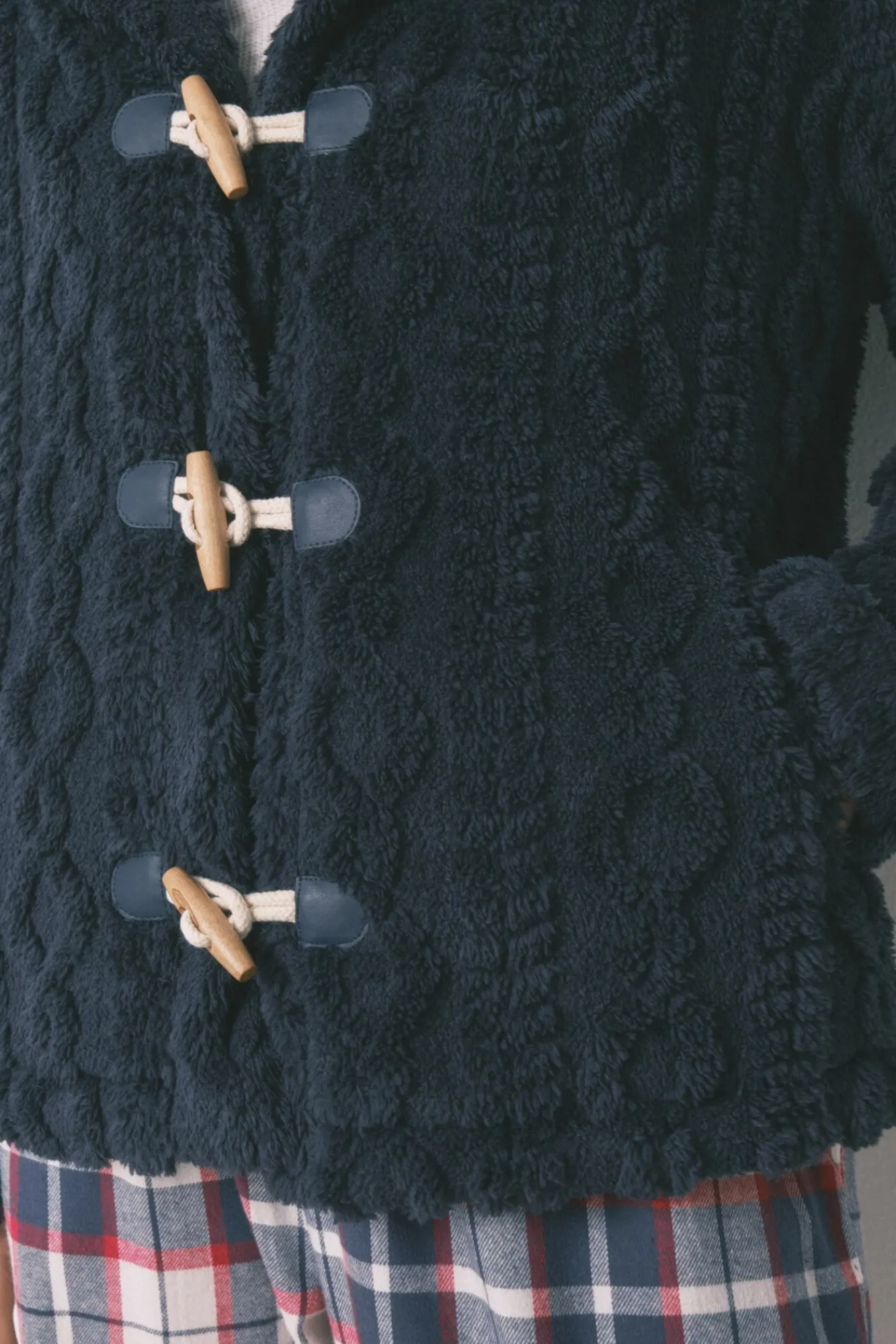 – Fecho frontal com carcela e botões de madeira.