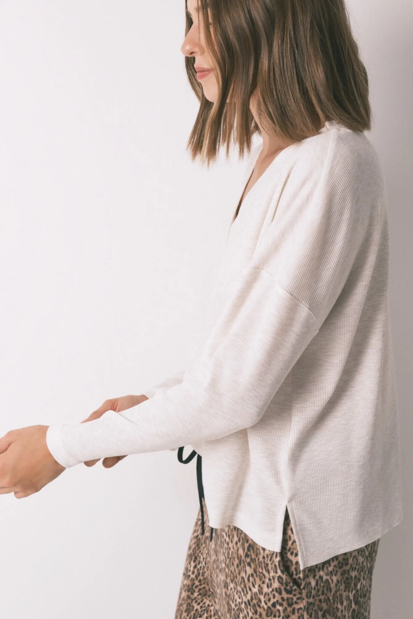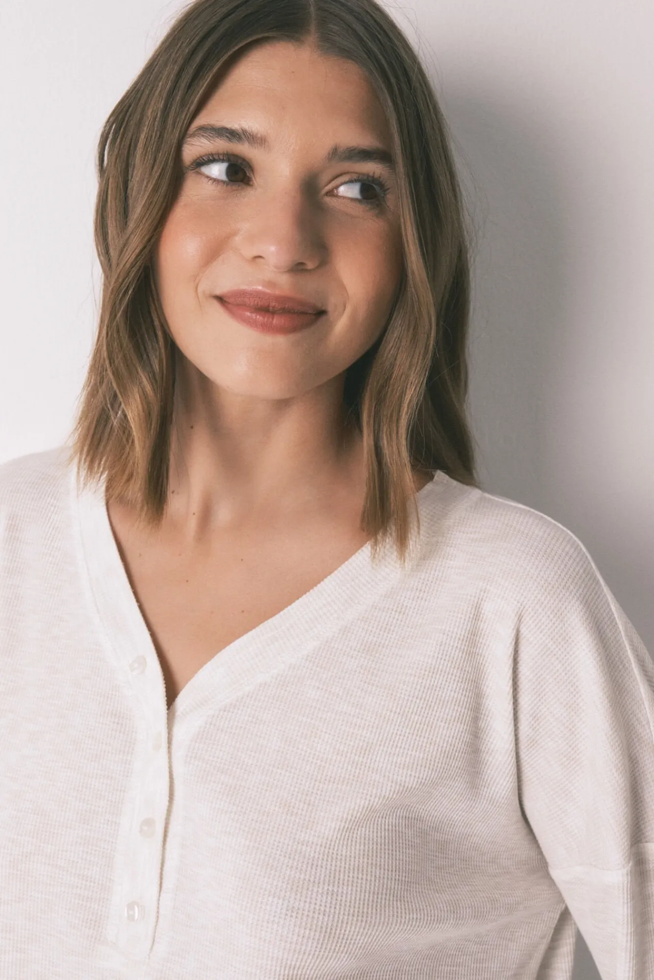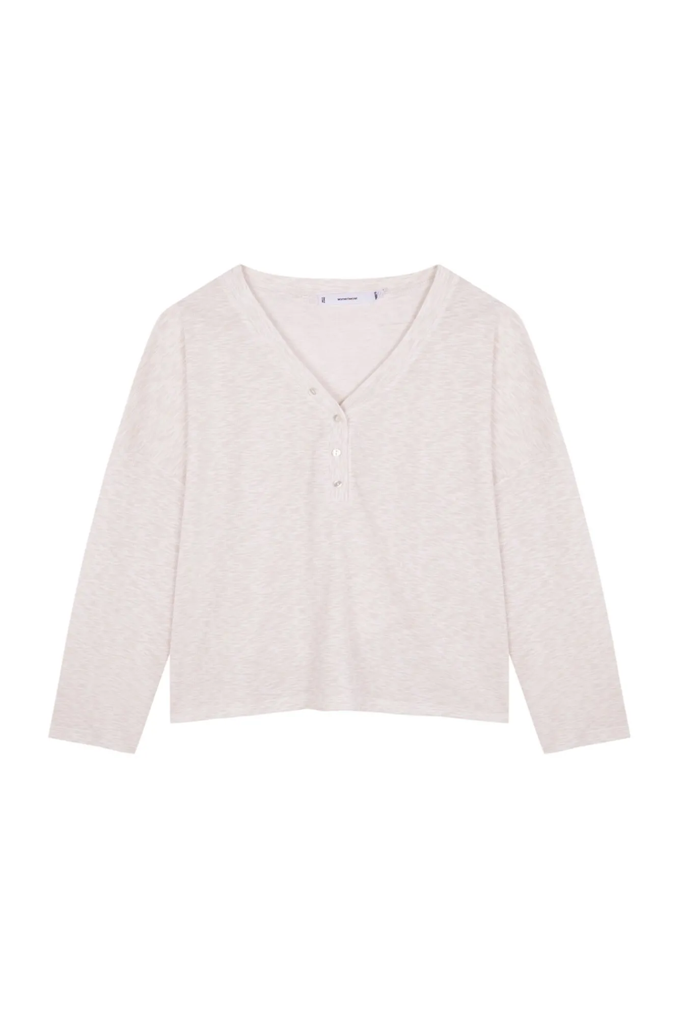– Apresenta decote em V polido com debrum elástico e fecho de botão combinando.