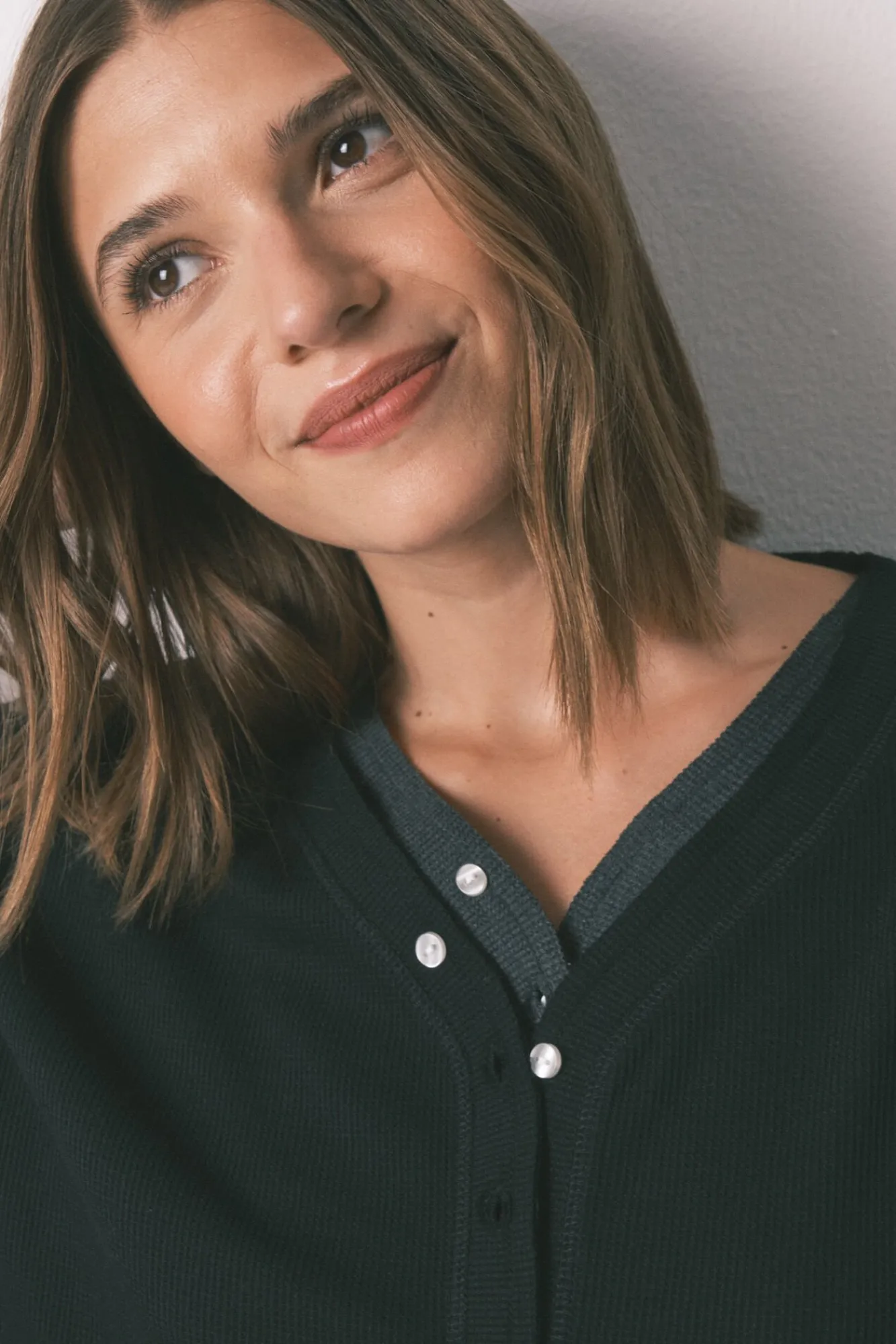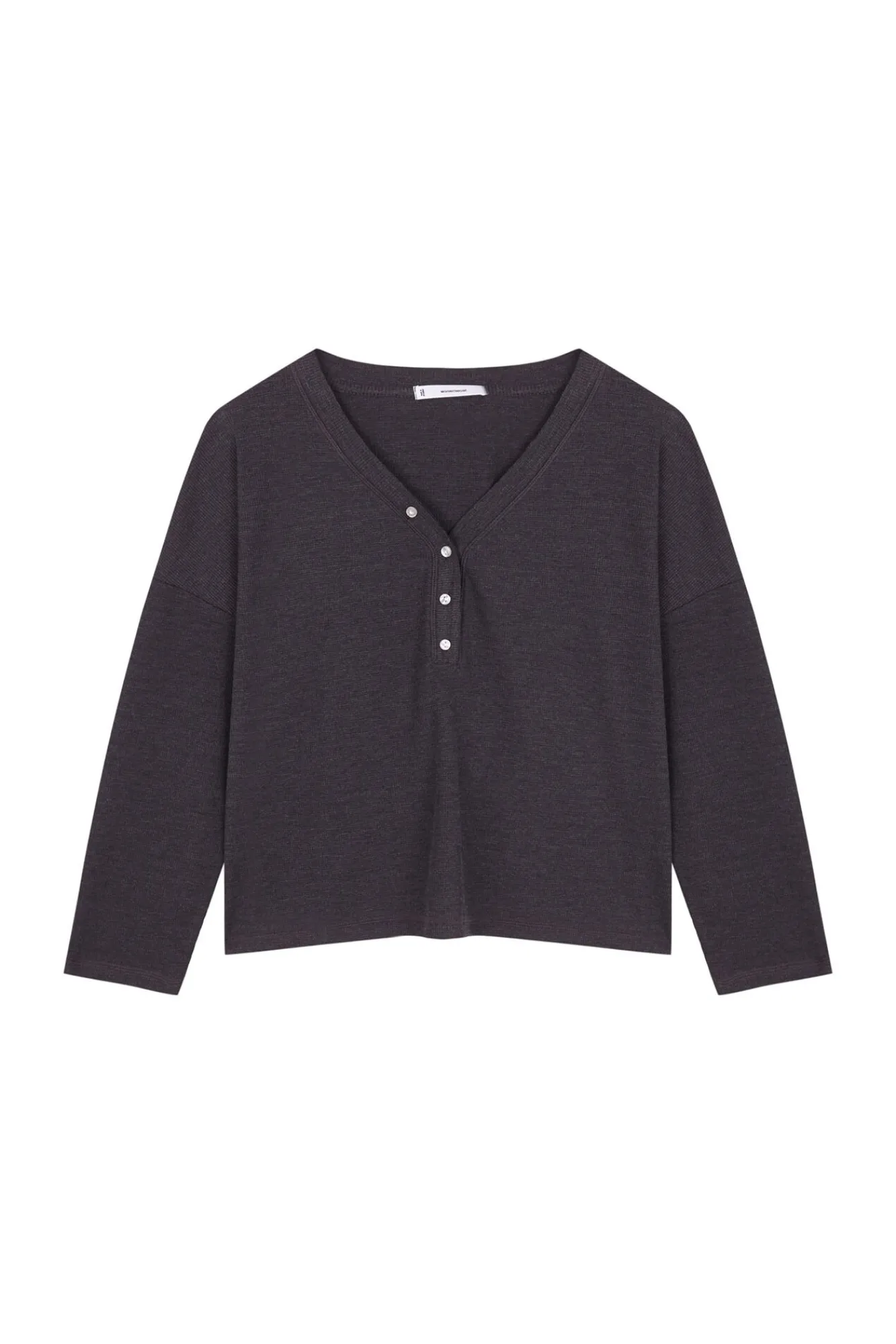 – Apresenta decote em V polido com debrum elástico e fecho de botão combinando.